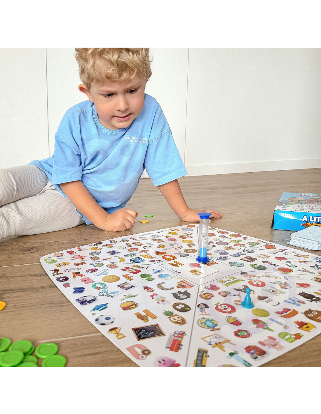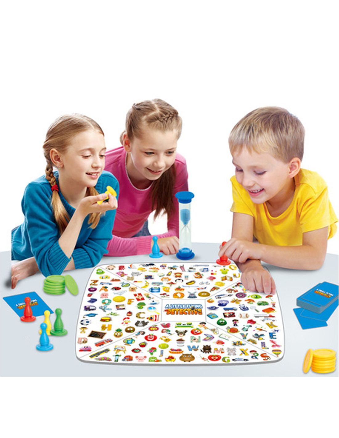 - Little Detective: Prepare the board, cards (clues), and coins. Divide the cards as follows: two players each with 8 cards, three players each with 6 cards, and four players each with 5 cards. Cards cannot be peeked at. Each player chooses one card. Start with the youngest player. Flip your card (clues) over and place it in the center of the board. Three patterns will appear on the clue card. The player must find the pattern as quickly as possible and cover it. If three patterns are found, the round ends. For each correct pattern, the player receives a detective coin. If they guess the pattern incorrectly, they must return the coin. The hourglass is used to measure time; when the timer runs out, the round ends.