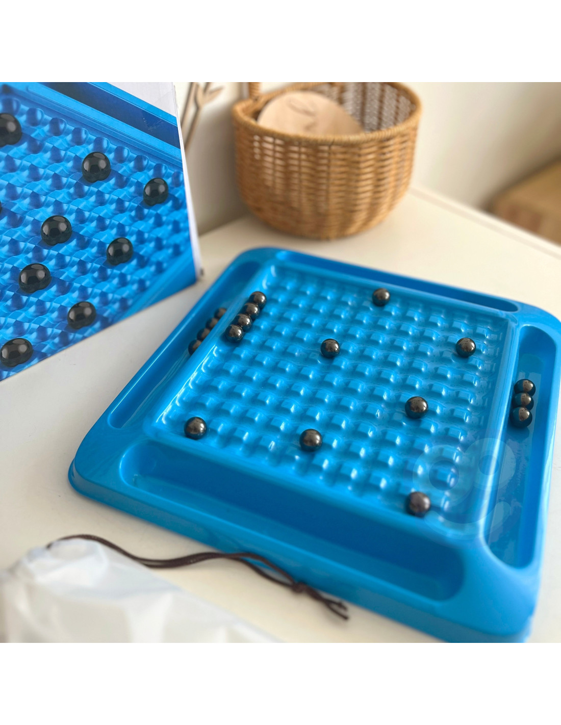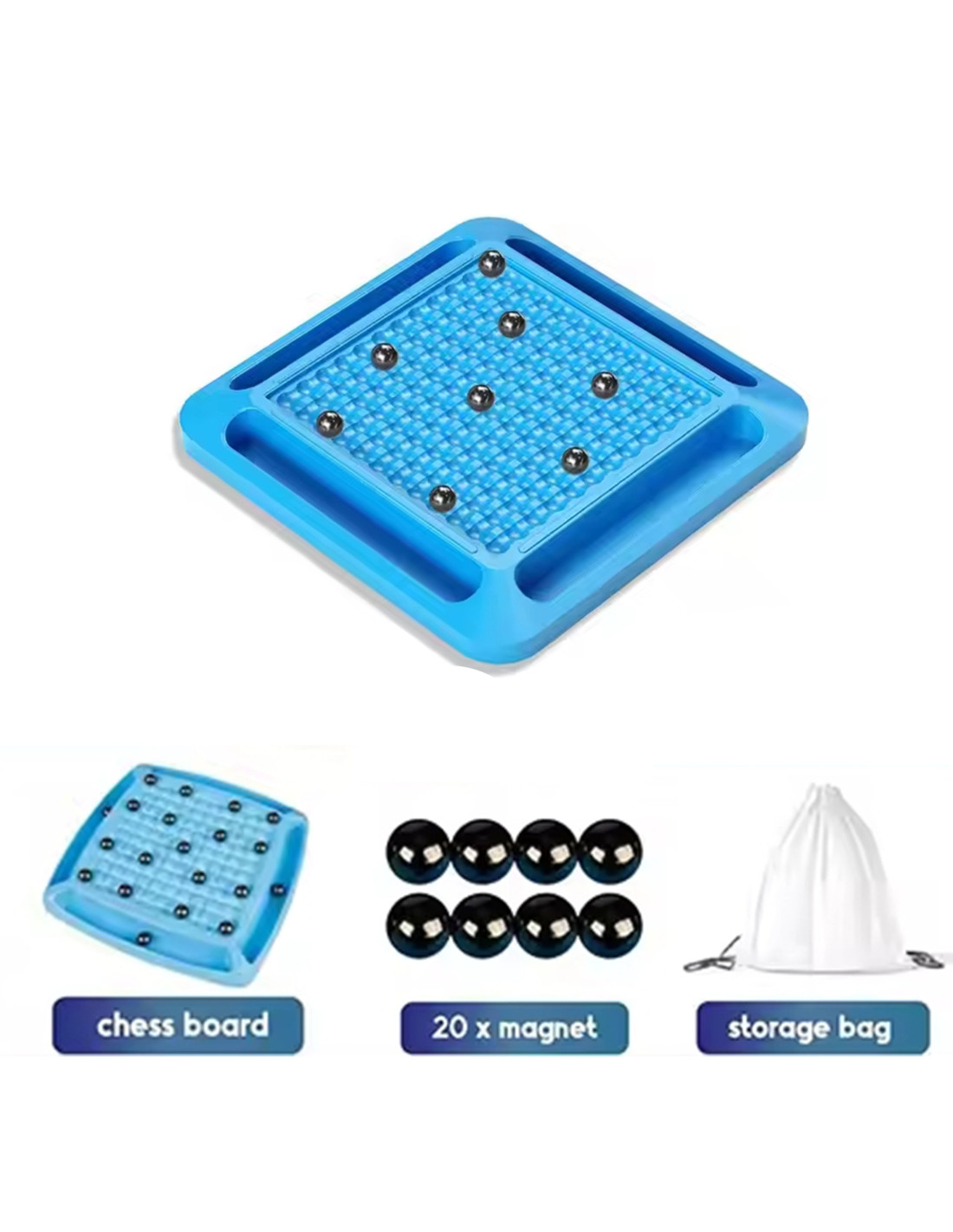 - The set includes: 20 magnetic balls, a game board with 4 shelves for magnets, a bag for the balls.