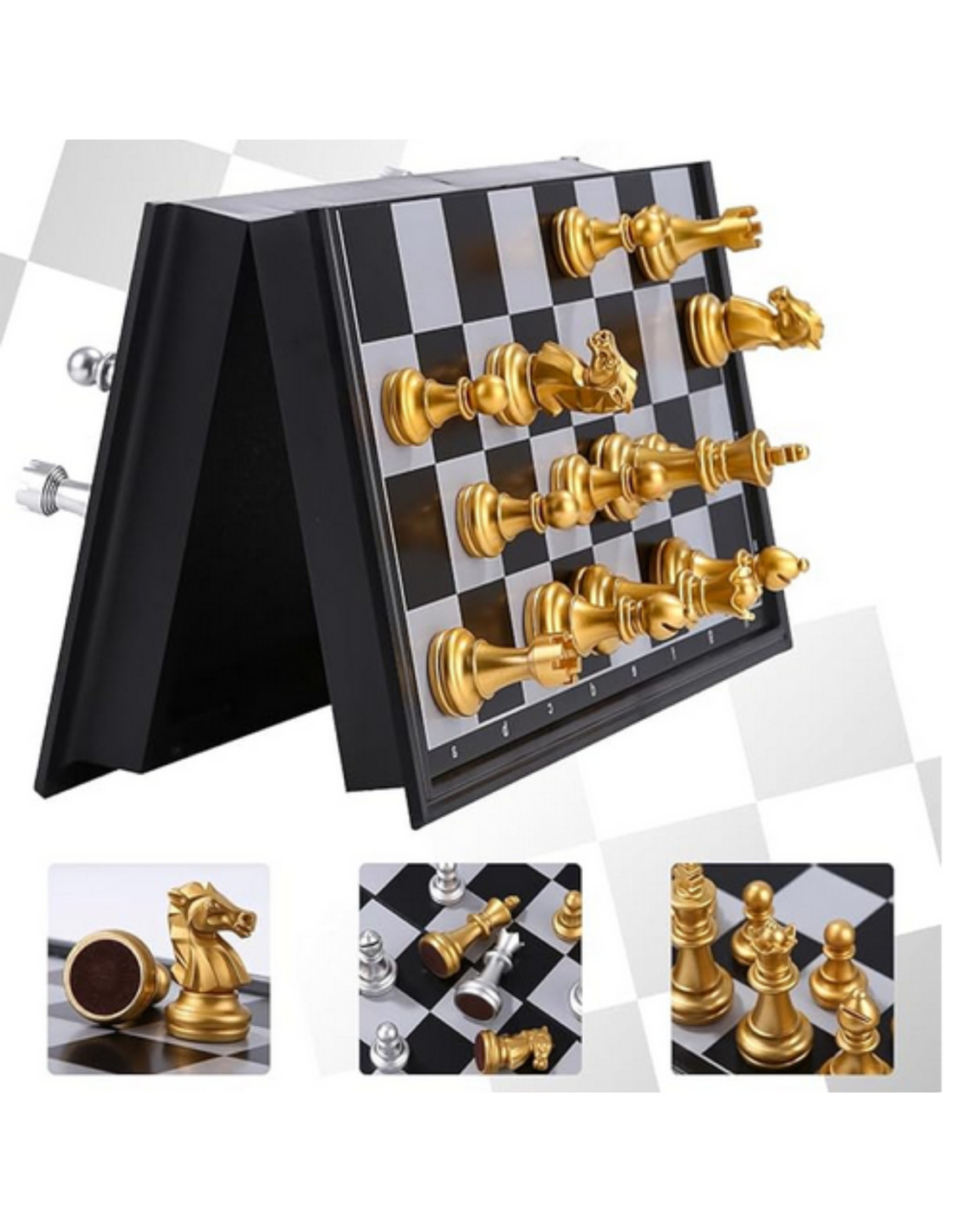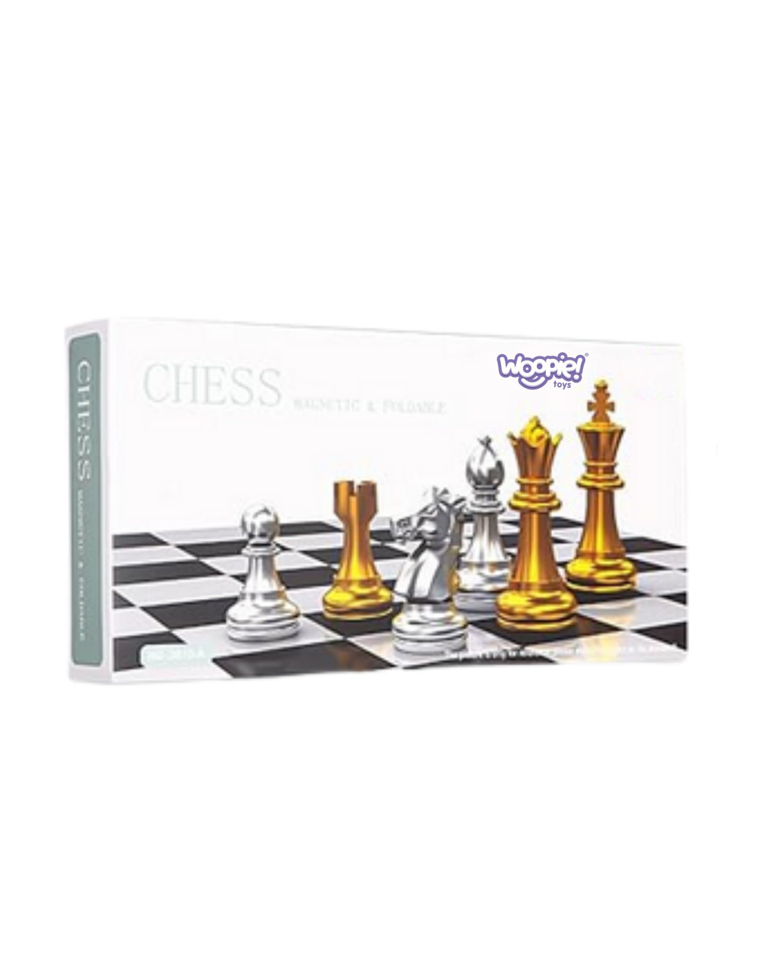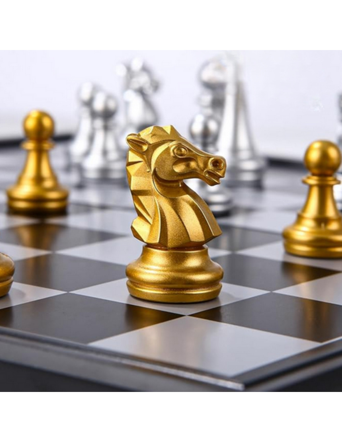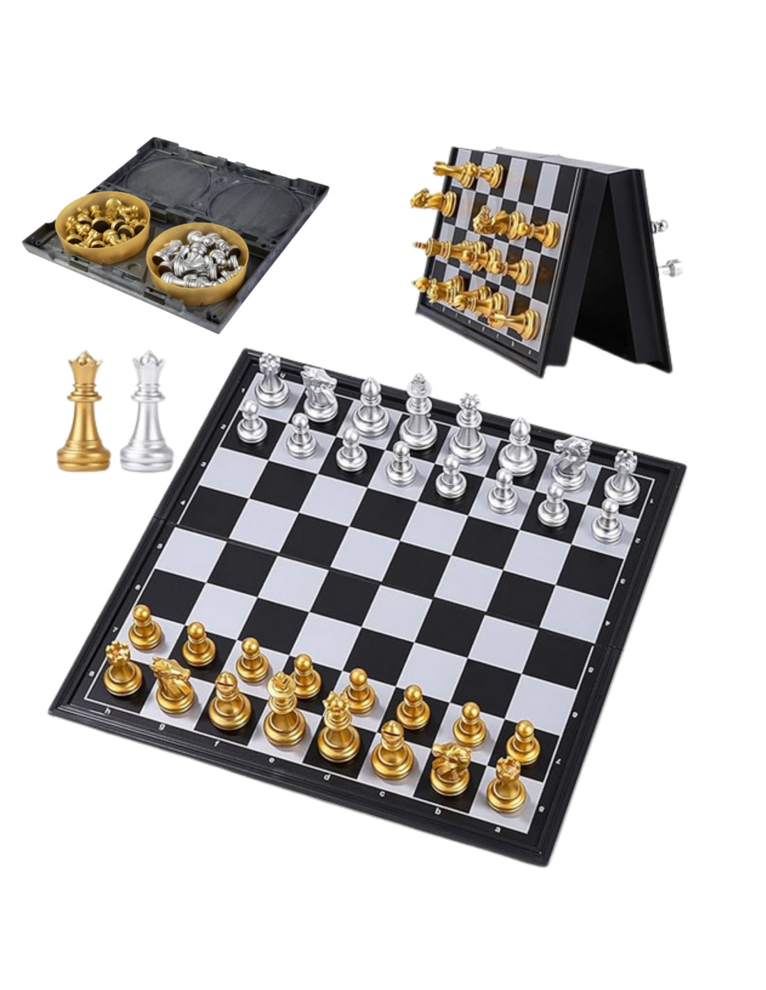 This foldable magnetic chess set from Woopie is an elegant and practical option for fans of classic strategy games who value portability and aesthetics. Featuring gold and silver elements, the magnetic board ensures the pieces' stability even when transported. Its foldable design and compact size make it ideal for both home and travel—on the train, on vacation, or visiting friends. The pieces are made of a lightweight, durable material with a metallic finish—gold and silver—which adds elegance and prestige to the set. The folding mechanism allows the entire board to be reduced to a compact size, making it easy to store and transport without the risk of pieces falling apart.