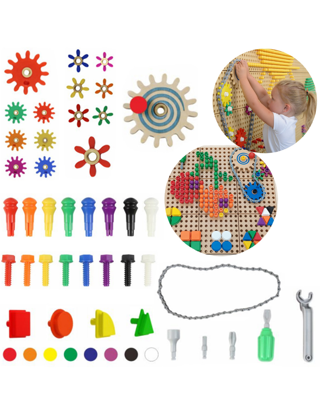 The Masterkidz STEM Accessory Set includes essential accessories for playing with the Masterkidz STEM system . It includes 128 pegs, 128 screws, 64 geometric pegs, two tool sets, 18 gears, a wheel with a handle, and a chain. This set is designed for creative play and exploring the world of science through experimentation and construction . Children can use these accessories to create a variety of patterns and structures, developing their manual skills, logical thinking, and understanding of basic mechanics and engineering principles. This set is a perfect start to playing with the Masterkidz STEM system . It is compatible with both wall-mounted and free-standing boards, although one of them is required to begin play.