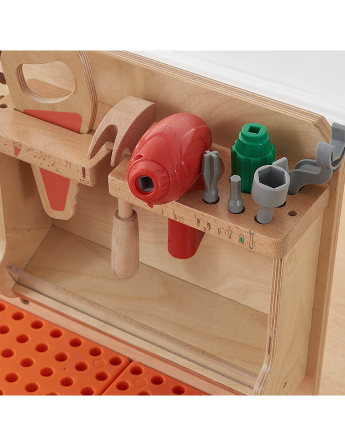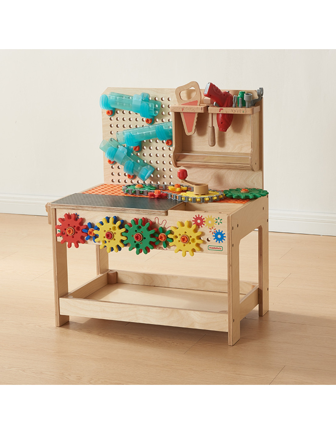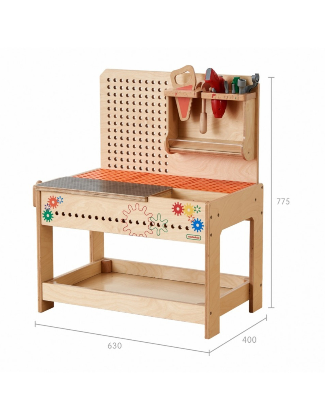 The Wooden STEM Educational Workshop allows for creative play and exploration of the world of science. The table features a panel with holes into which you can insert colorful and geometric pegs, screws, and gears to create scientific experiments and beautiful patterns. The 42.5 cm tabletop height is suitable for children aged 3 and up. Children will love creating real, functioning logic systems using realistic tools.
