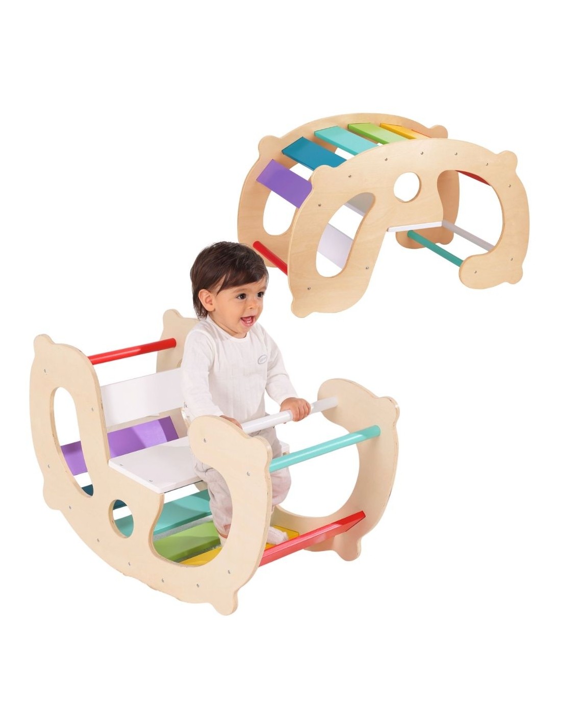 This multifunctional wooden rocker from Woopie Green is one of the most popular Montessori-inspired educational equipment! With its simple, arched design and colorful rainbow tiles, it becomes a magical tool for developing children's physical skills and imagination. It can be used as a rocker, a balancing bridge, a tunnel for traversing, or even a seat or play table. Natural wood combined with vibrant colors creates a safe space where young children can experiment with movement, explore their body's limits, and build self-confidence.