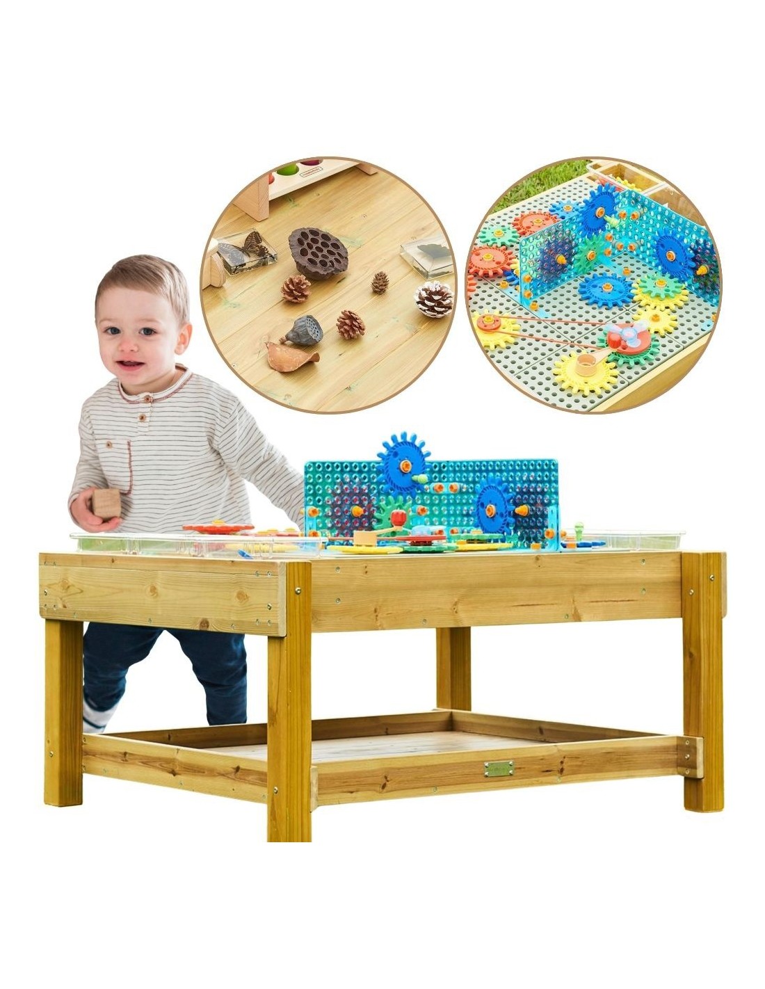 Designed for creative outdoor play, this sturdy wooden STEM educational table from Masterkidz combines learning with movement, experimentation, and great fun for children aged 3 and up. With a perforated top and a practical lower shelf, it offers virtually limitless construction and exploration possibilities . Made of impregnated wood, it's resistant to weather, mold, moisture, and UV radiation. It's the perfect play center that fosters curiosity and encourages children to explore science together.