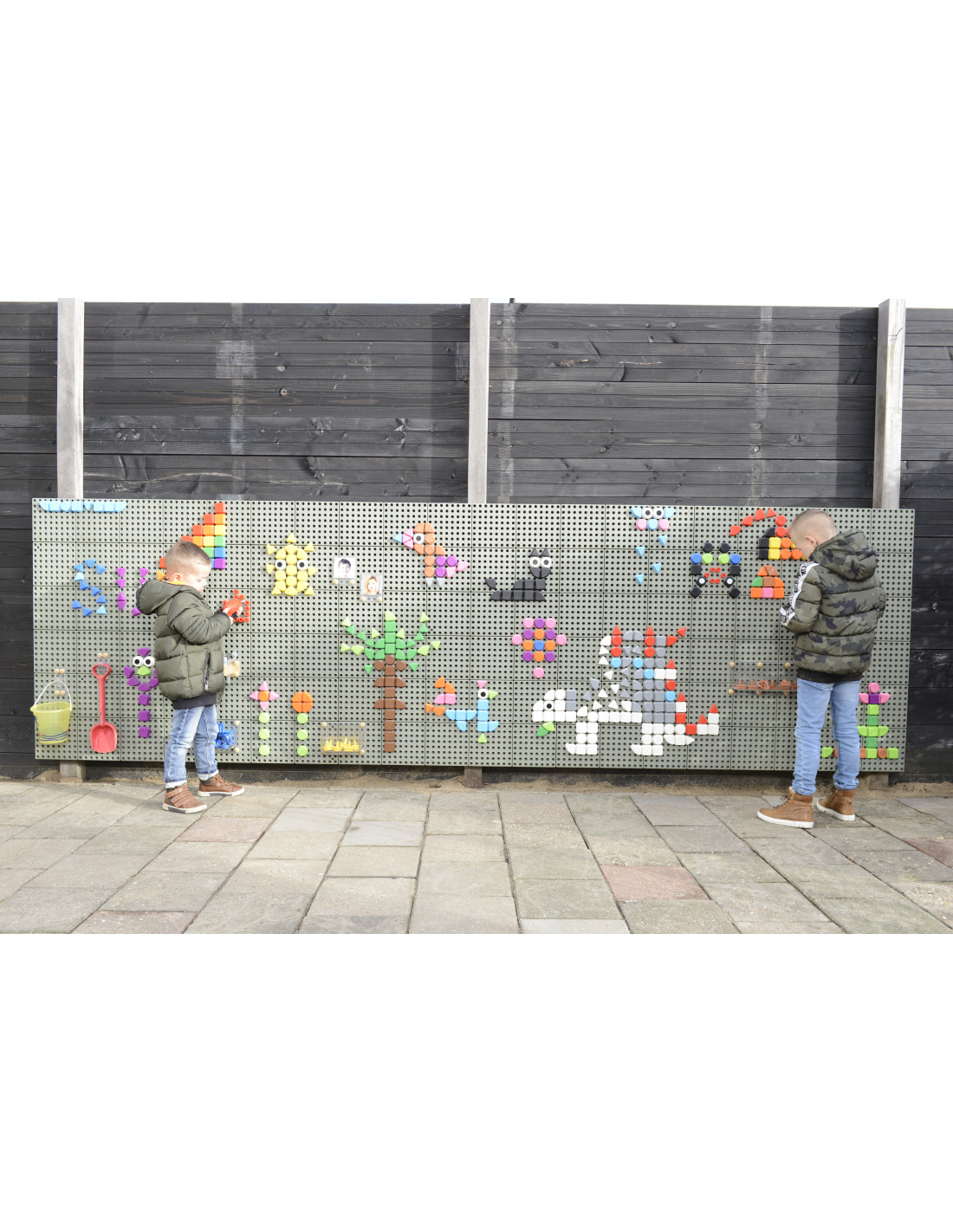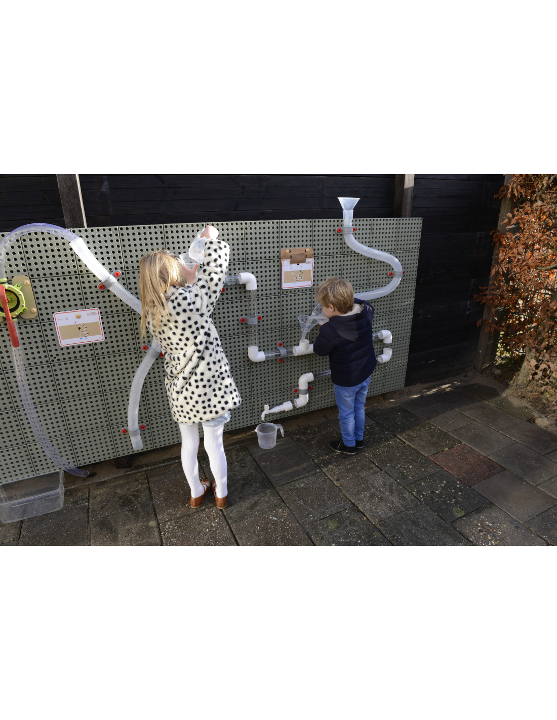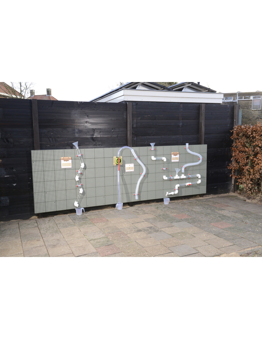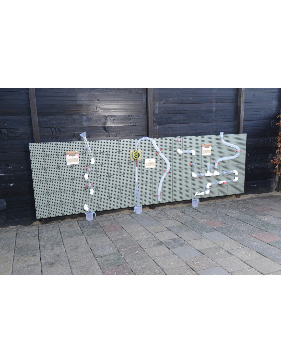 The Masterkidz Outdoor STEM Educational Wall Board allows for creative play and exploration of the world of science. The wide 80x120 cm panels feature holes into which colorful pegs can be inserted to create beautiful patterns. Various educational aids, gears, pipe systems with a pump, and other interesting elements can also be attached to the board.
