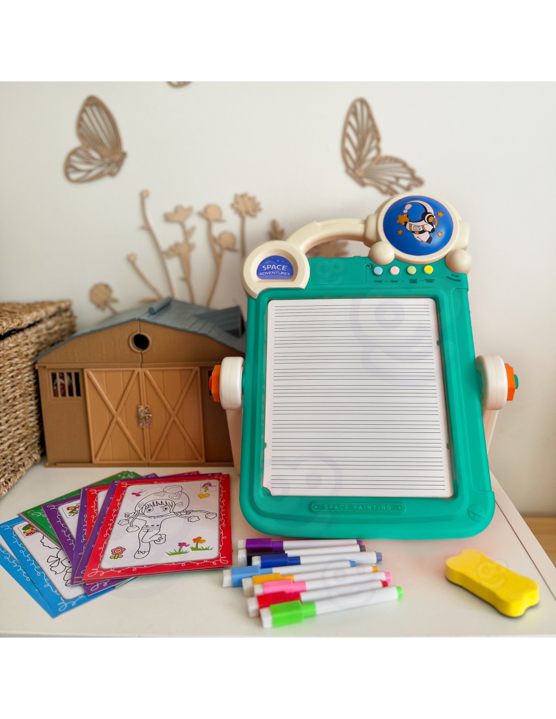 The Woopie Double-Sided Drawing Board and Tetris Game is a 2-in-1 educational puzzle toy that will bring many benefits to your child. The drawing board includes 8 markers , an eraser, and 36 erasable cards for coloring or writing. Four music buttons make drawing more enjoyable. The other side of the board features a fun Tetris puzzle that will engage every child, develop imagination, and creative thinking. The colorful blocks can be stacked vertically, flat, or horizontally to create interesting shapes and images, or separate 3D structures.