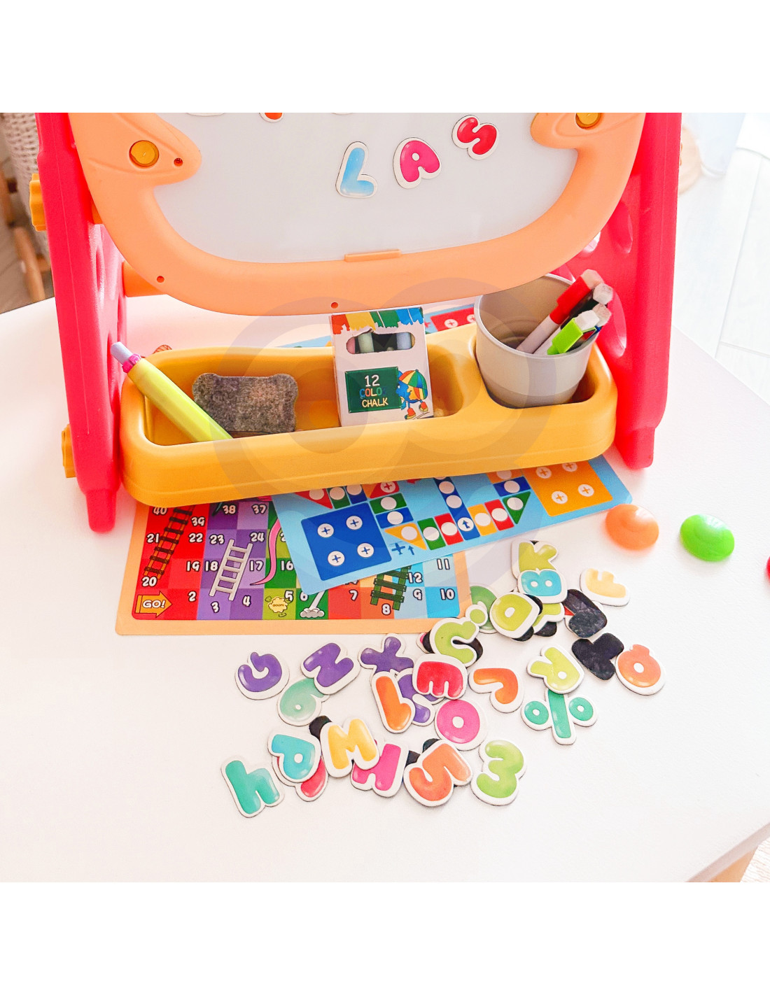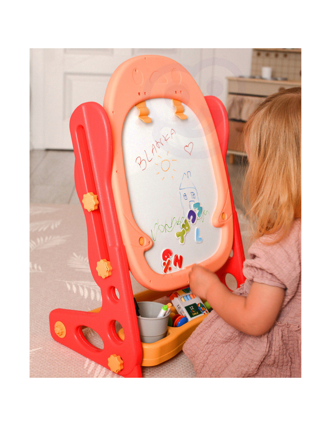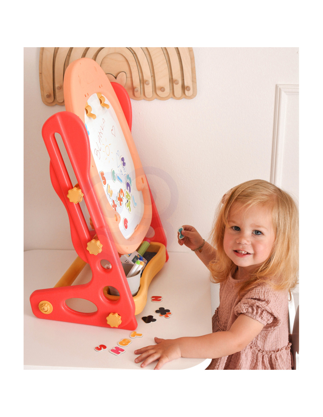 The Double-Sided Magnetic Drawing Board from WOOPIE is a versatile tool for learning and developing artistic skills . The set includes a full set of accessories for versatile use. The board is easy to assemble and features height adjustments , making it adaptable to any child. This toy is essential for a child's daily development .