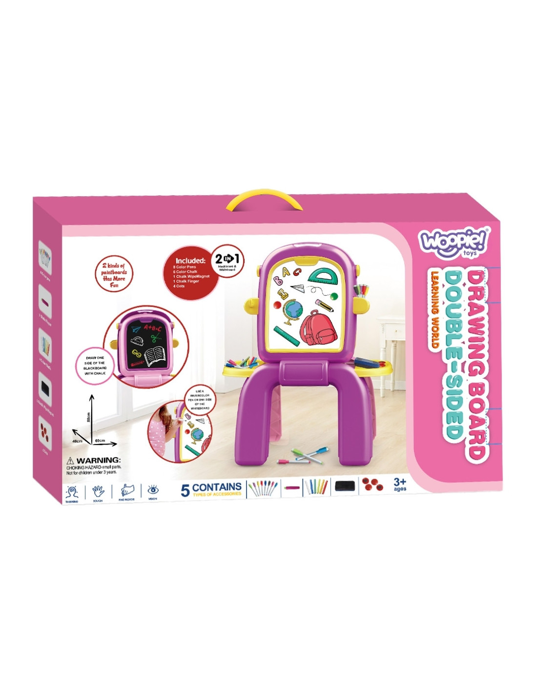 This unique, colorful 2-in-1 board is a great solution for every little artist, explorer, and student . Your child will be able to draw, write, learn letters and numbers, learn colors, develop fine motor skills, and spend time creatively—without staring at a screen! Playing at the board isn't just great fun—it also supports imagination, concentration, and fine motor skills. The double-sided surface (white and black) and a wide range of accessories (markers, crayons, magnets) make the possibilities virtually endless.
