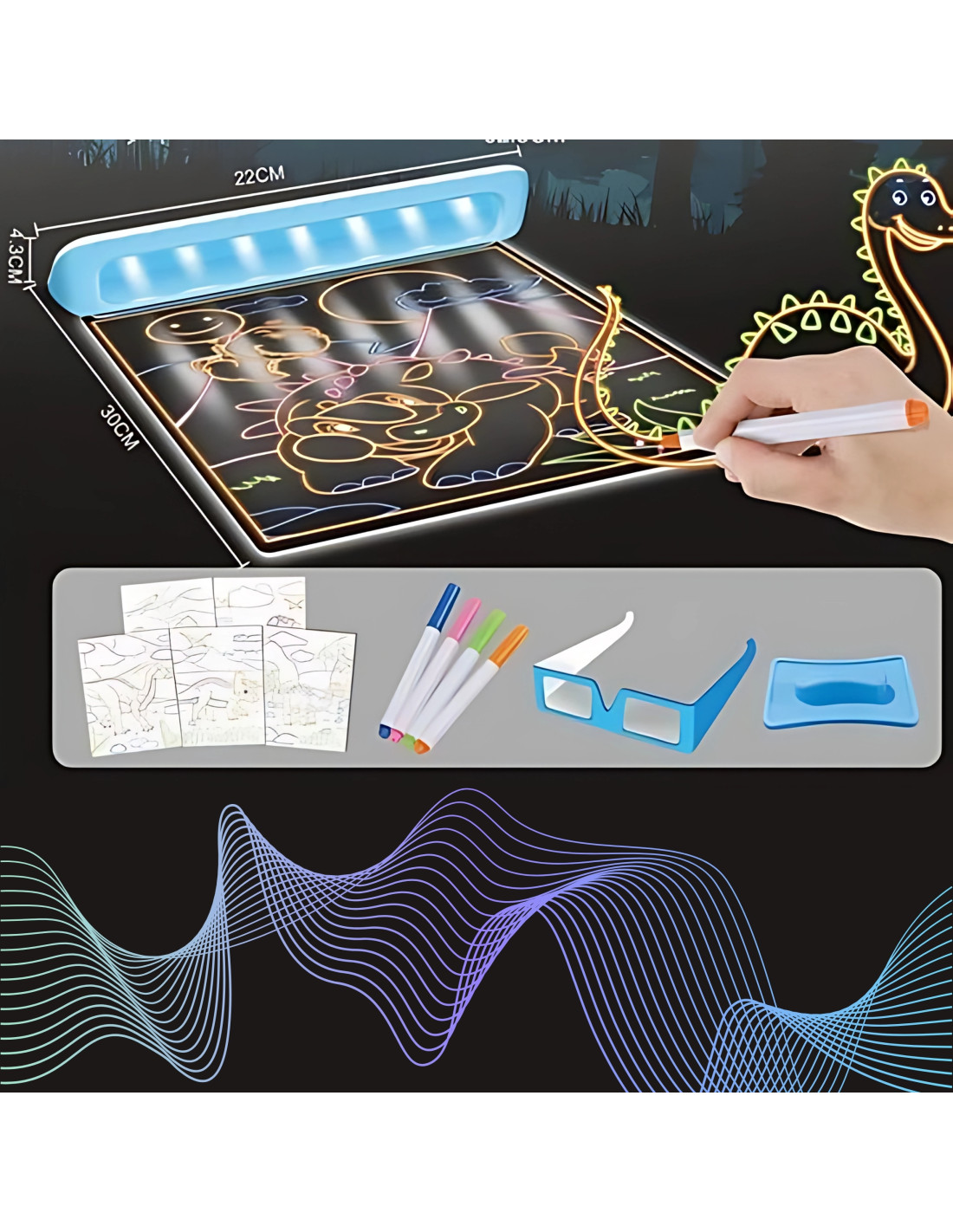 Surprise your child with a modern way to draw! This 3D magic board lets you create three-dimensional drawings using special fluorescent pens and sketches. Thanks to built-in LED lighting and the included 3D glasses, every drawing literally comes to life!