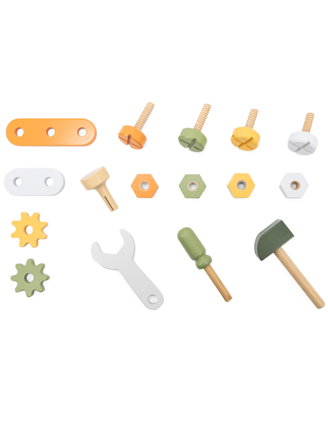 The Viga Wooden Tool Box from the PolarB collection will provide great fun for any little DIY enthusiast. The set includes a hammer , a wrench , a screwdriver , 4 pairs of screws and nuts , a dowel , 2 gears, and 2 panels with holes . Children can explore different tools and develop their skills in turning, striking, and matching. The tinkering activity will support the development of manual dexterity , spark curiosity, and stimulate children's imagination .