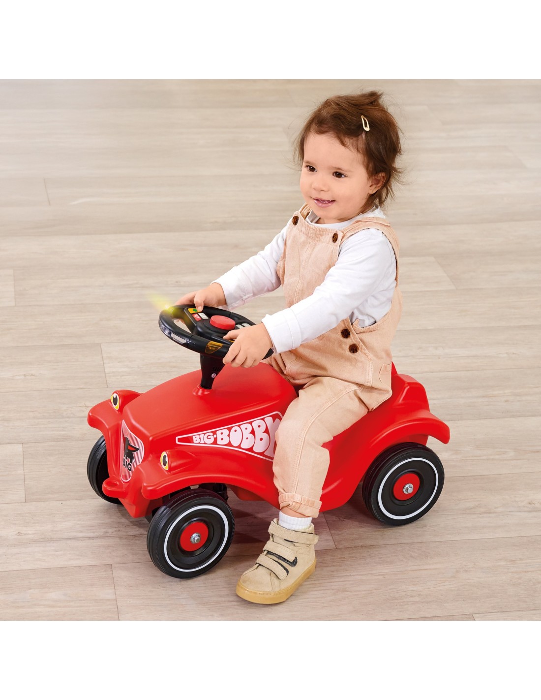 The BIG Bobby Car Racing is an advanced steering wheel with light and sound effects that transforms ordinary play into a thrilling race. Equipped with LED hazard warning lights, turn signals, and headlights, it provides a realistic driving experience. An electronic horn, a radio with the BIG Bobby Car theme song, and a telephone allow children to become real drivers. Central locking and a push-button start with an authentic engine sound further enhance the immersive experience. This is the perfect accessory for the BIG Bobby Car ride-on, taking children's motoring to the next level.