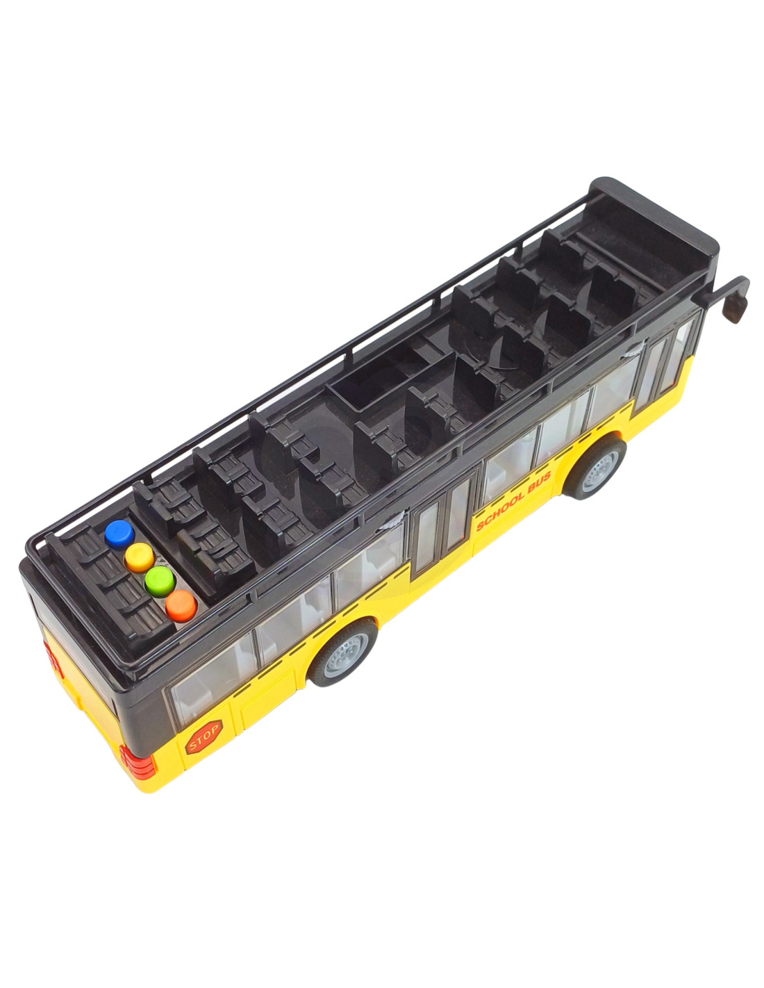 The Bus with Lights and Opening Doors from WOOPIE has two opening doors on one side. The vehicle is also equipped with a friction drive; simply push the door forward to drive it forward. The toy makes sounds and a blue light inside the vehicle lights up . It's perfect for children who enjoy playing with various vehicles.