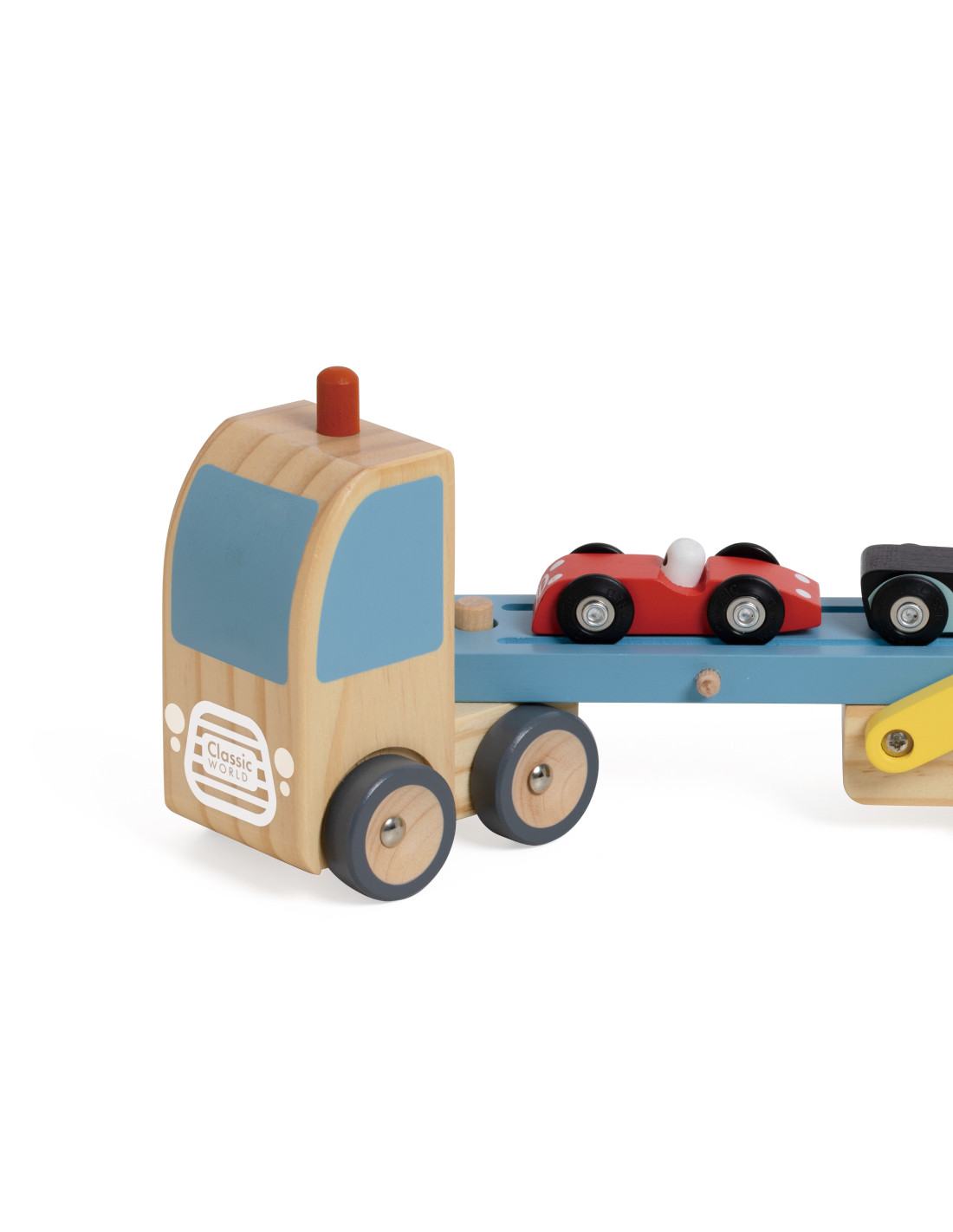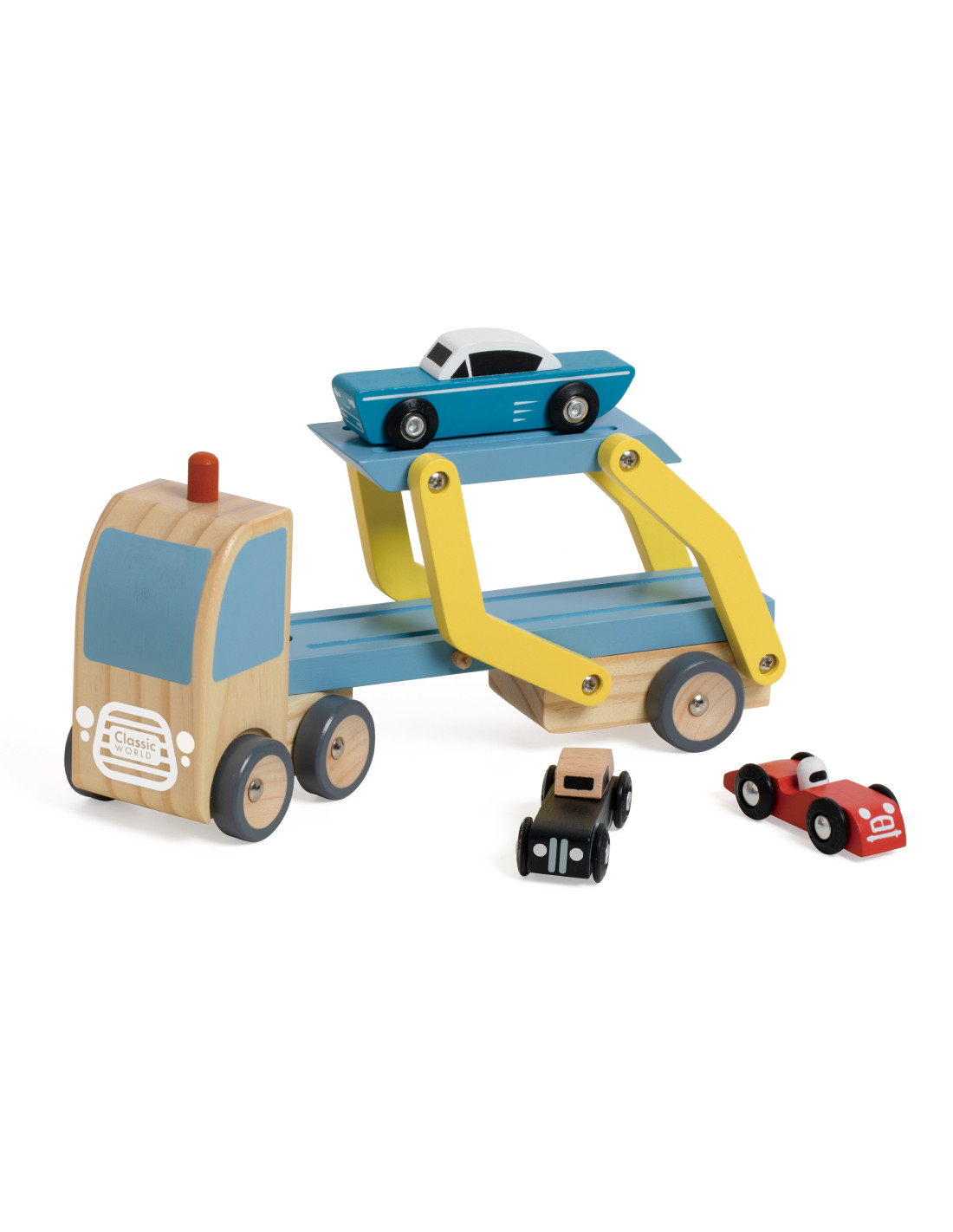 The Wooden Car Transporter from CLASSIC WORLD is a durable and high-quality toy set that includes one truck, a ramp with a flatbed, and three vehicles. This toy helps children develop fine motor skills and hand-eye coordination while providing hours of fun loading and unloading.