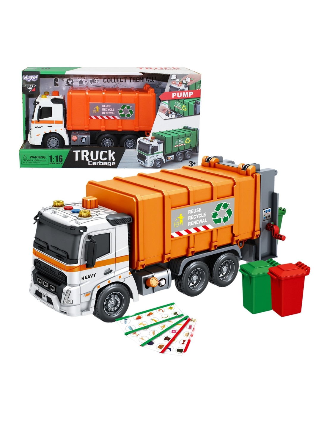 This toy garbage truck is a perfectly replicated municipal vehicle that's sure to delight any young urban vehicle enthusiast. Made of durable materials and featuring a distinctive orange and white color scheme, it will become a favorite in your child's toy collection. It features numerous moving parts and interactive features that make play not only enjoyable but also educational.