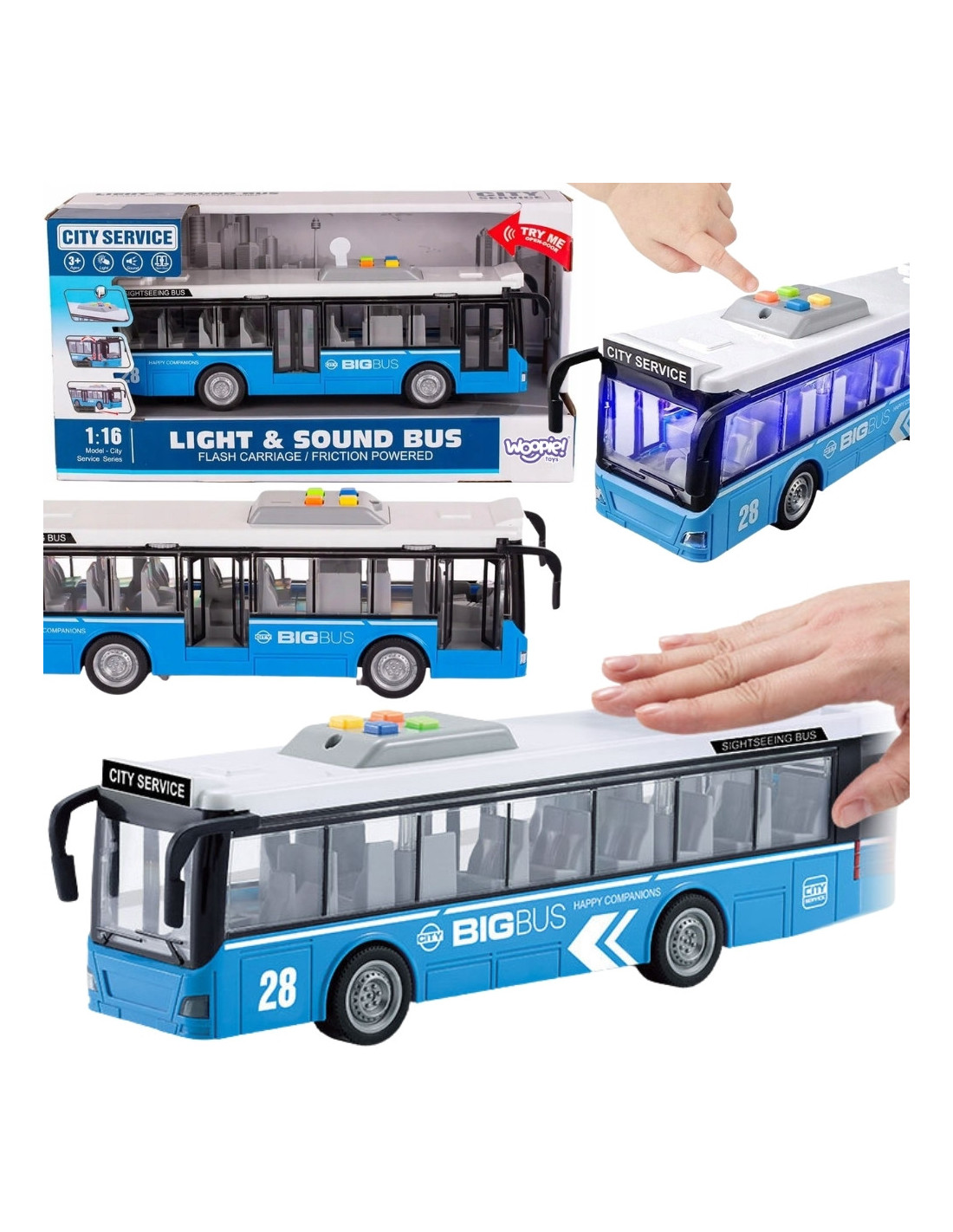 - - Sound effects – after pressing one of the four buttons on the vehicle's roof, the bus produces realistic driving, engine starting, reversing and horn sounds