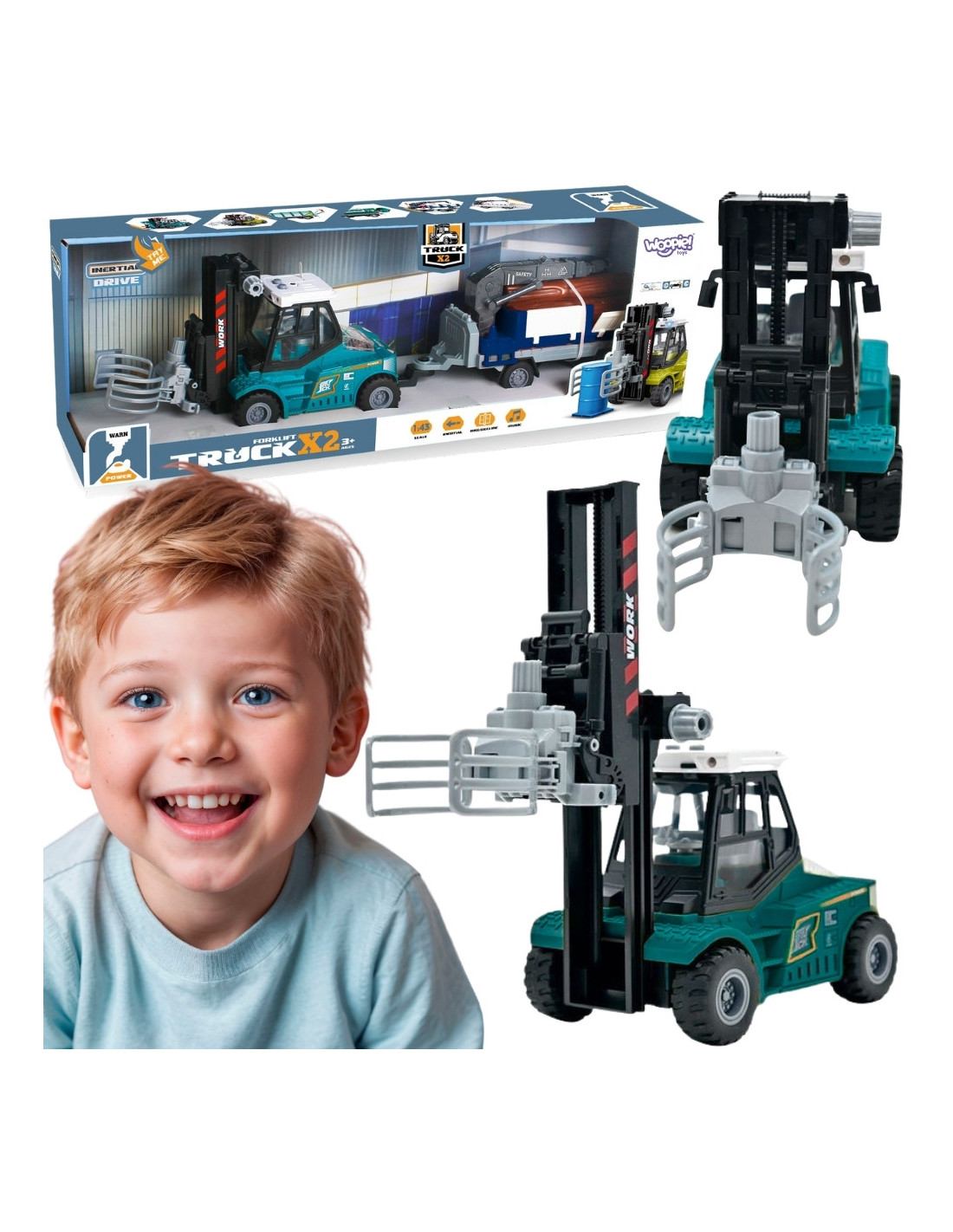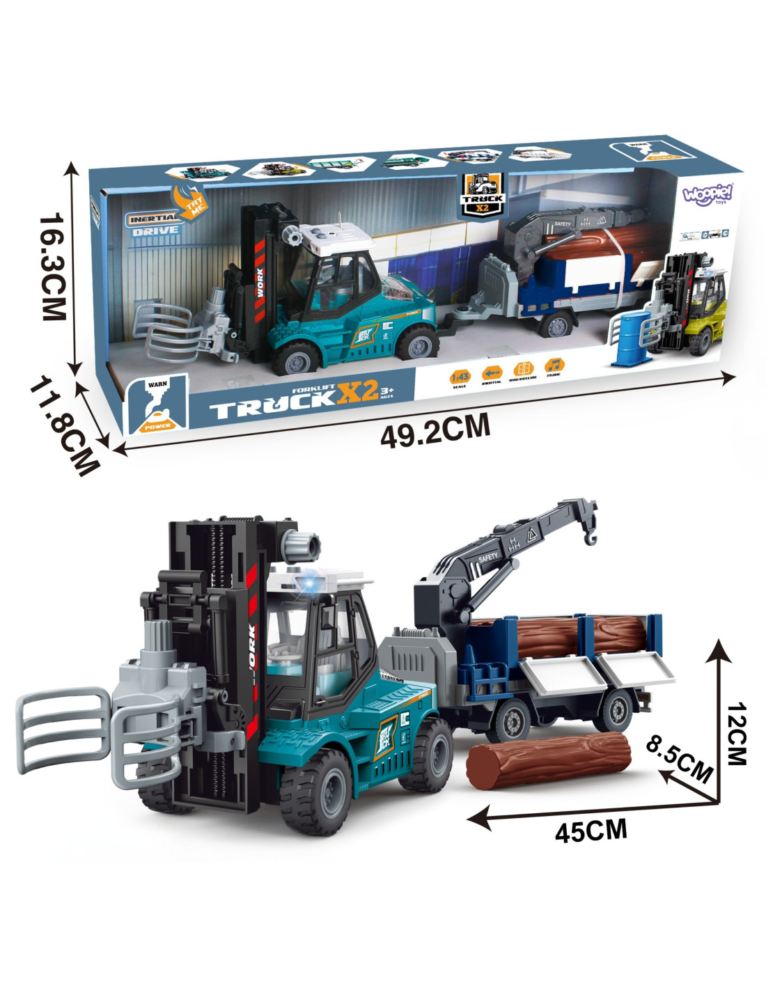The Woopie forklift with a trailer for transporting timber is not only an interesting and realistic toy, but also an excellent tool for supporting children's development. The model is made of high-quality, durable materials that ensure safety during play and a long product life. The truck is equipped with an inertial drive, meaning it moves forward on its own when pushed, further enhancing play and stimulating children's imagination. The forklift has a movable gripper that allows for lifting and carrying wooden logs, allowing children to role-play realistic scenes related to transport and storage. The trailer with opening sides allows for easy loading and unloading of beams, which promotes the development of manual skills and hand-eye coordination. This helps children learn logical thinking, planning their next moves, and precision in action. Additionally, the toy is equipped with light and sound effects that simulate real-world operation, further engaging children and stimulating their senses. Engine sounds, warning signals, and the sounds of lifting cargo make play more realistic and exciting. All the toy's elements are carefully designed to be easy to operate, even for small hands, while also being durable and resistant to heavy use. This is a great choice for young vehicle enthusiasts and all kinds of transport machinery.