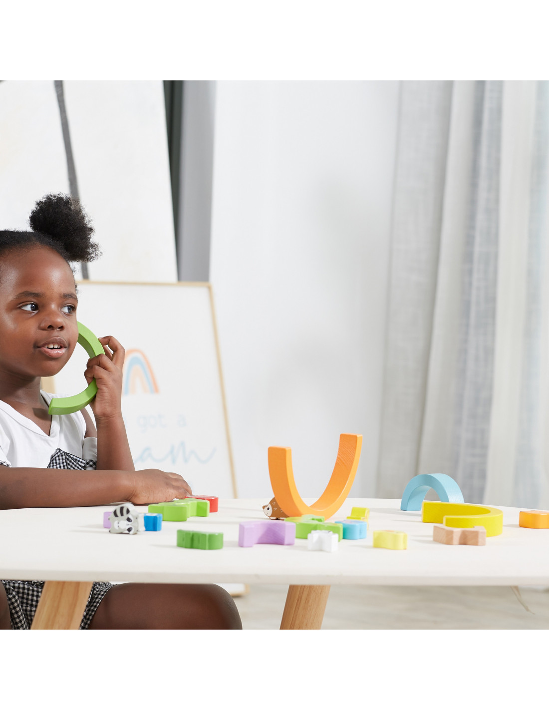 The Wooden Rainbow will spark a child's imagination from the very beginning. Children can arrange the blocks into a rainbow and discover the order in which the colors are arranged. These colorful arches offer many more play possibilities. They can be used to create a colorful tunnel or stack one on top of the other. Thanks to the included animals, children can build houses with the arches and create obstacles for them to overcome. It's the perfect toy for role-playing various scenes.