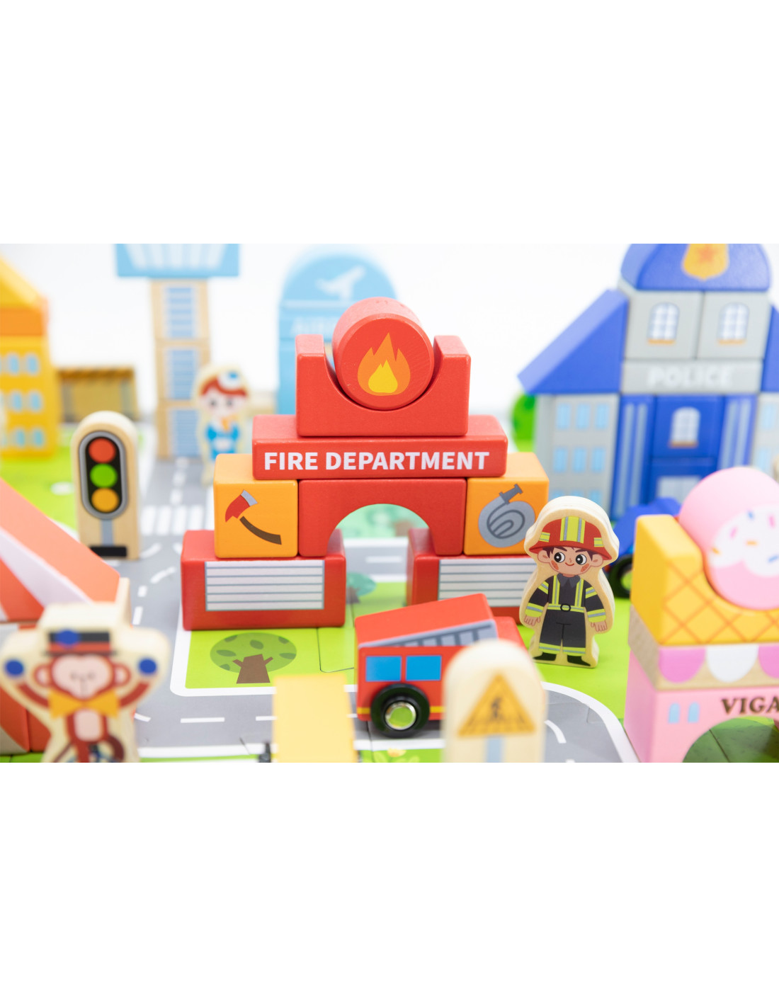 The Wooden City Building Set from Viga is the perfect toy for aspiring architects who want to create their own city plan. Unfold the model and use blocks of various shapes and beautiful colors to build a city! The set includes 60 blocks, which can be used to build a school, hospital, police station, fire station, airport, candy shop, and circus, and then place them anywhere on the city board. In addition to the buildings themselves, the set includes 5 vehicles, 6 figurines of characters from various professions corresponding to the city buildings, and additional accessories, including road signs and trees. Everything is conveniently packed in a bucket for easy storage.