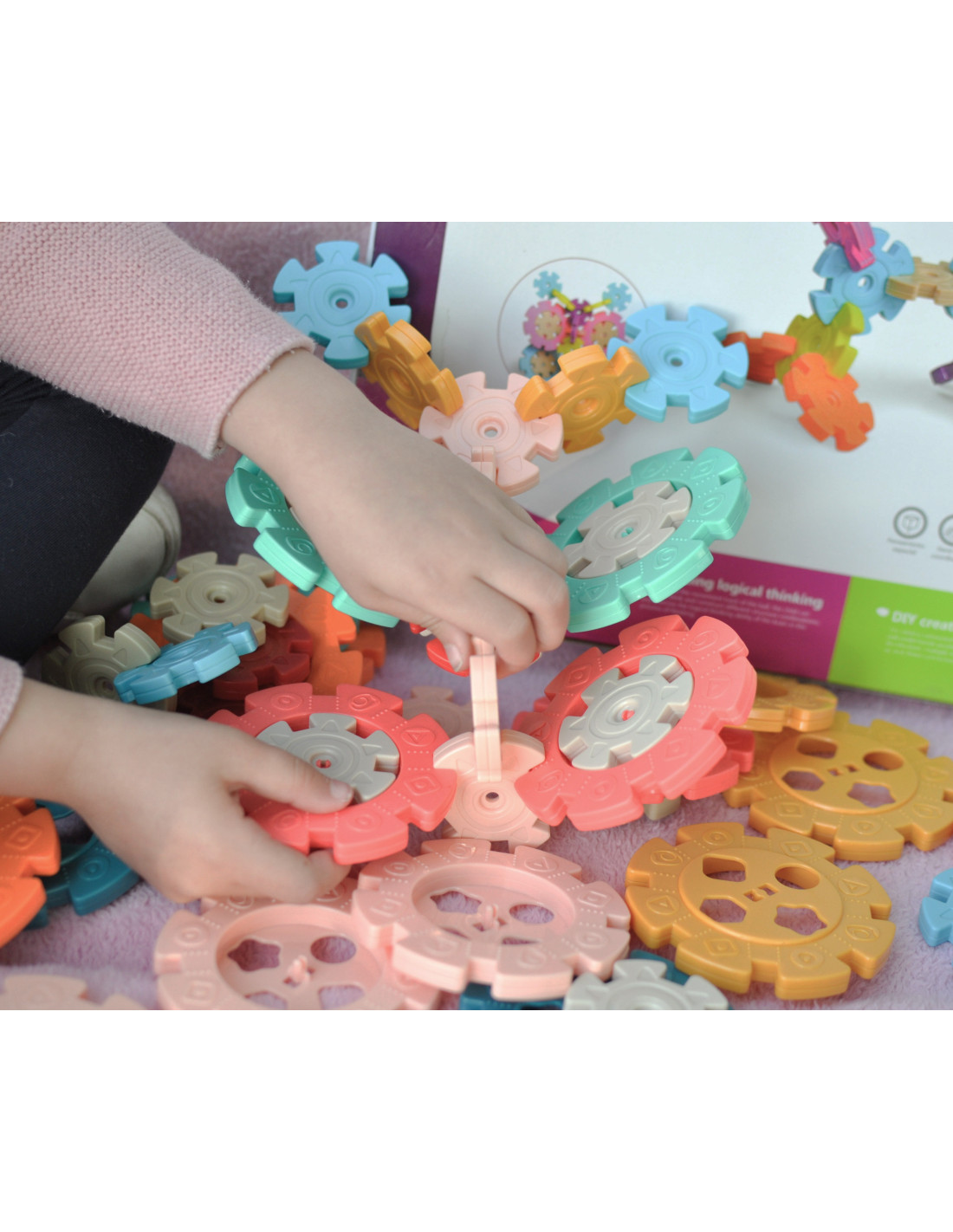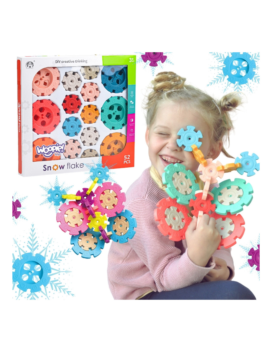 Wafer Construction Blocks from WOOPIE will captivate and fascinate your child. The colorful elements resemble snowflakes. The blocks connect easily , and thanks to their structure and connection method, they can be used to create interesting three-dimensional structures . The holes in the snowflakes allow them to be connected diagonally , not just perpendicularly. The set contains 52 pieces: 18 large and 34 small blocks. Building the structure itself will develop your child's logical thinking , imagination , and creativity , and will help them concentrate while creating. By arranging the blocks, your child learns about shapes and colors and develops fine motor skills.