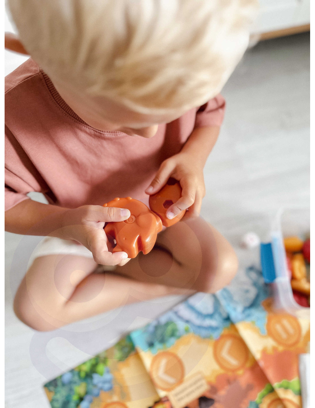 The Dinosaur 2-in-1 Construction Set Board Game from WOOPIE is the perfect toy for little dinosaur enthusiasts. The box includes 6 buildable dinosaur figures in various colors. The pieces connect easily by pressing and can be additionally covered with the included stickers. This allows children to develop fine motor skills, hand-eye coordination, and concentration. In addition to assembly and gluing, the set also includes a board game . Setting up the game is incredibly simple and quick: simply place the board and die next to the assembled figures. The goal is to complete the route as quickly as possible, and players move a distance corresponding to the number of dice rolled. Some spaces have special effects that can further enhance the gameplay.