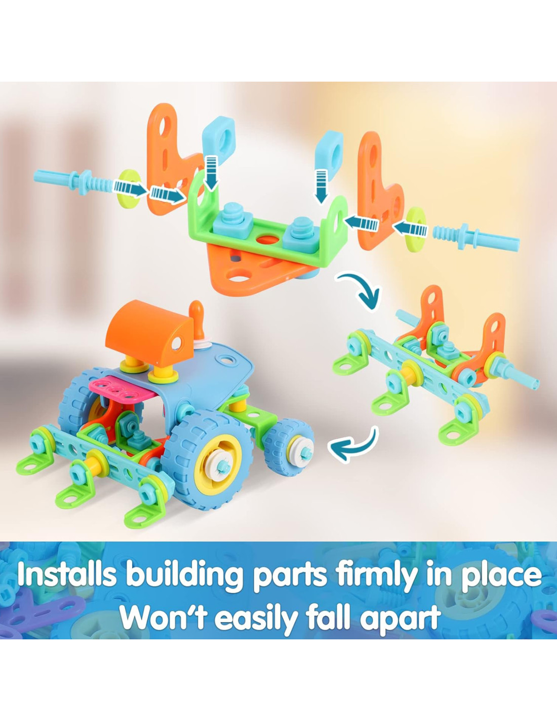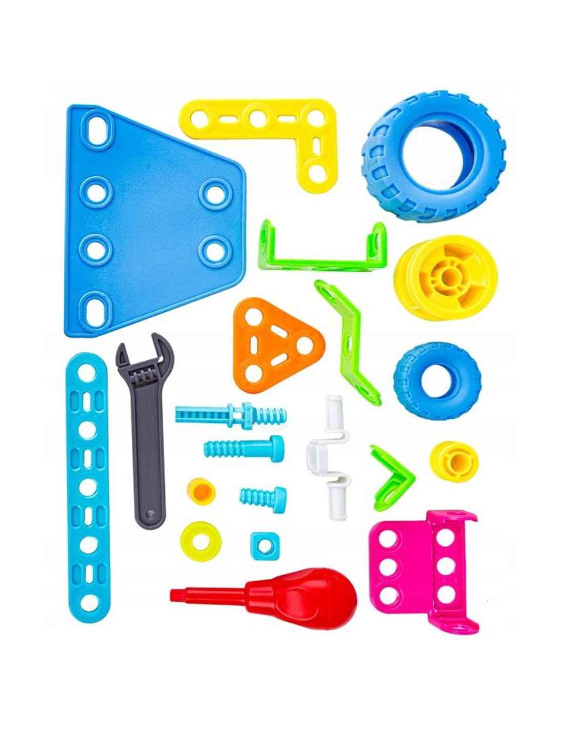 - The set includes: Various shaped blocks, Screwdriver and open-end wrench, Fastening screws with nuts, Wheels, Illustrated instructions for building 6 different vehicles