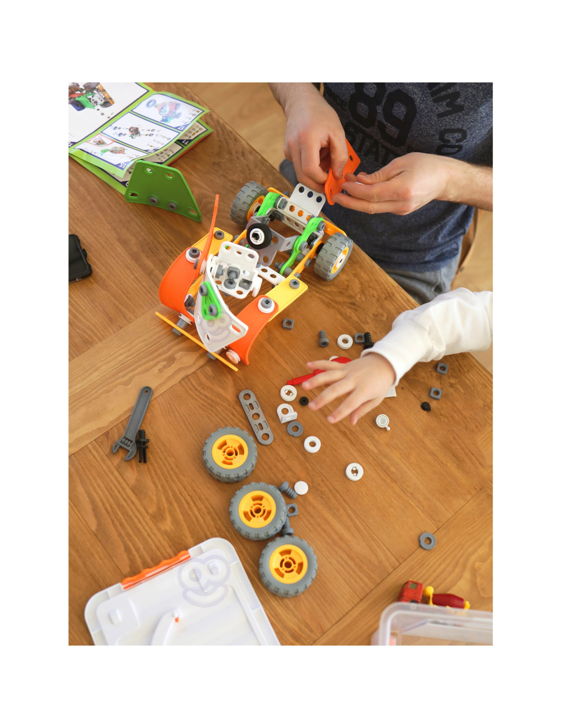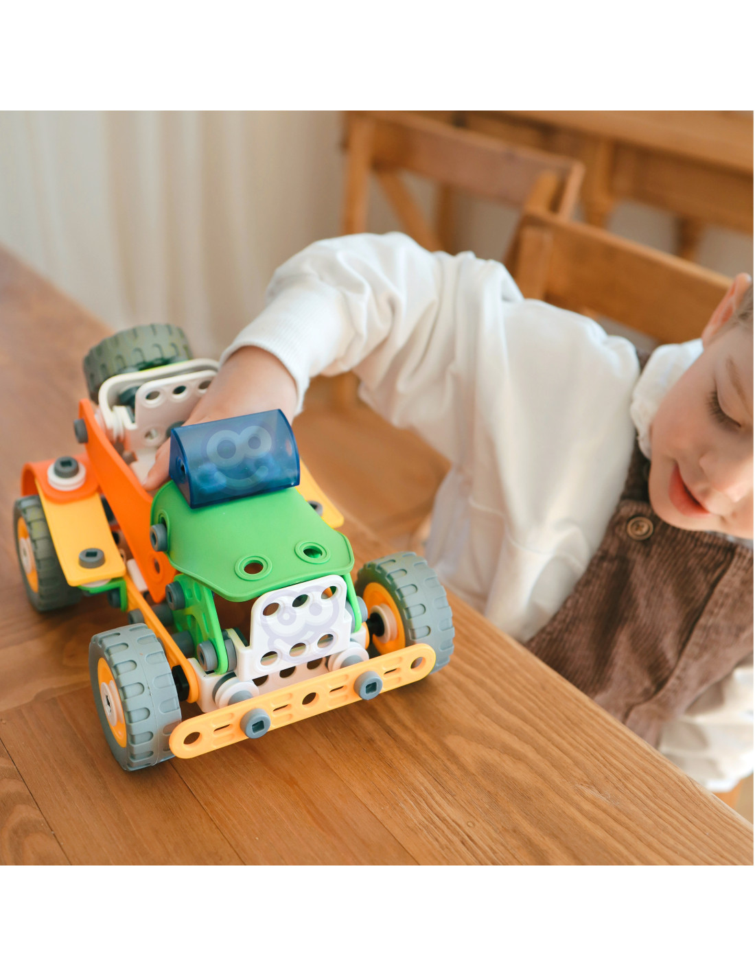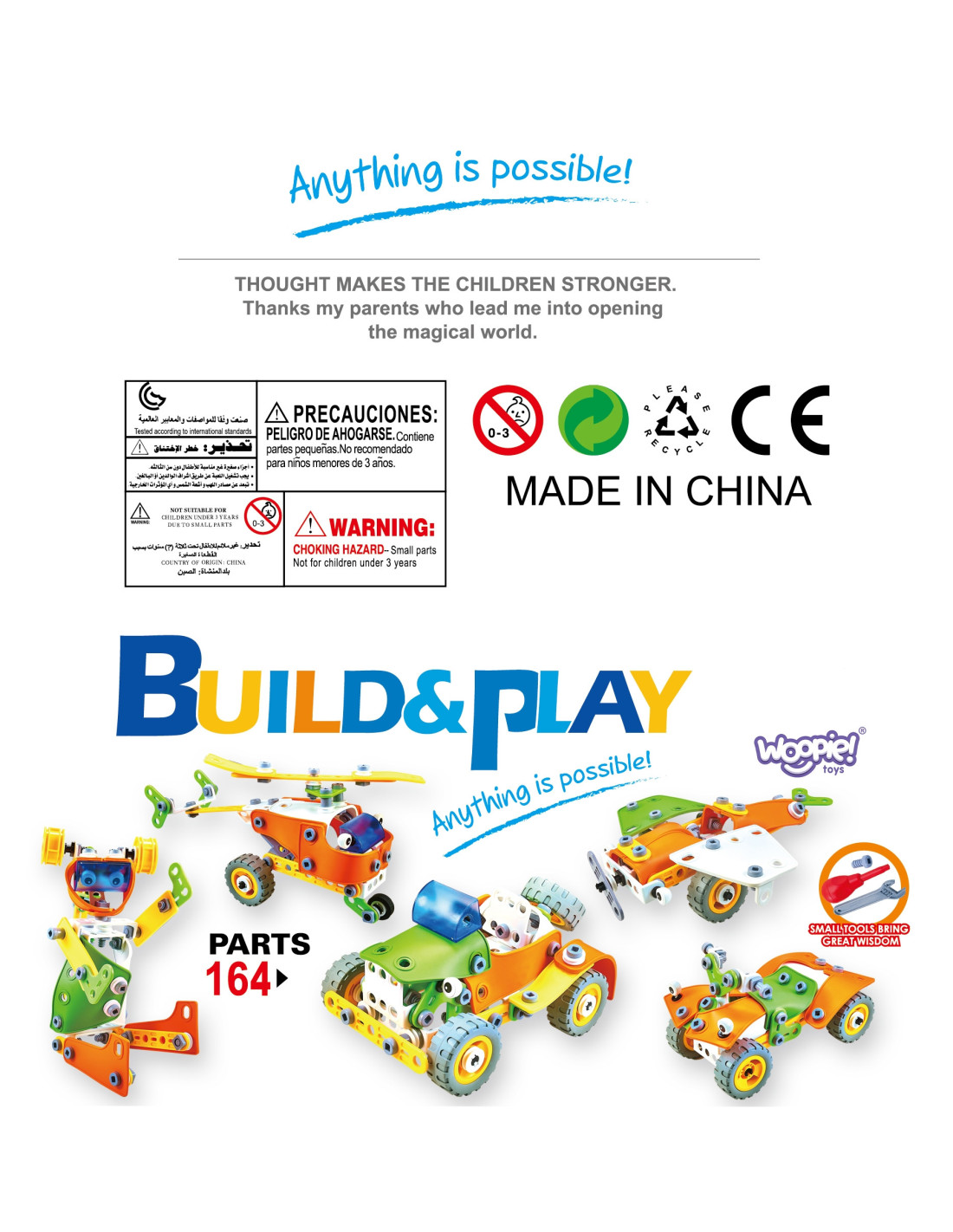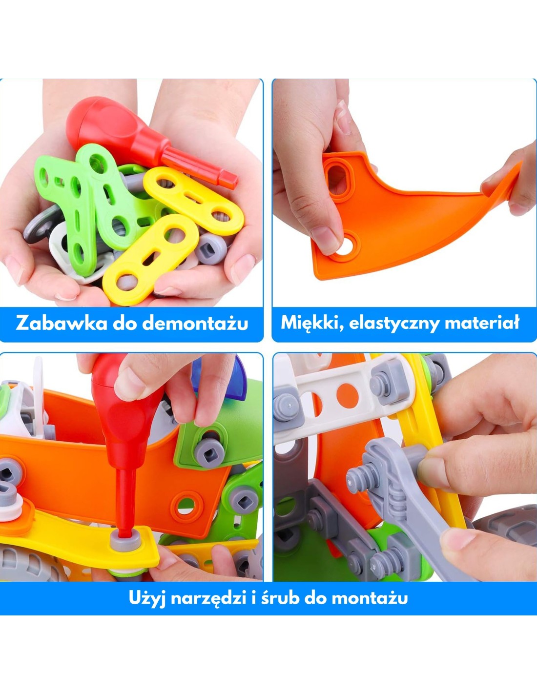 The 164-Piece 5-in-1 Construction Bricks set from WOOPIE is an excellent choice for any child who enjoys construction challenges and wants to develop their manual skills . Playing with this set can also be a great way to spend time with siblings or friends, teaching them cooperation and sharing ideas. With 164 flexible pieces, children can create up to 5 different models of vehicles and machines: a car , a quad bike , a helicopter , a plane , and a robot . Thanks to its innovative, flexible parts, the set not only allows for building but also allows for easy disassembly and assembly, allowing for many different combinations. The set is an ideal gift for children who are beginning to discover the world of construction, engineering, and mechanics through play!