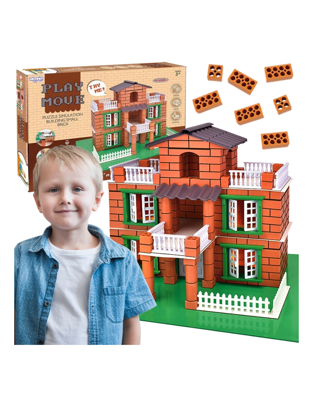 Brick building set - villa by Woopie This is a creative set for building a house from small bricks, which allows the child to take on the role of a little architect and bricklayer, creating realistic structures step by step using safe "mortar" and accessories just like in a real construction site.