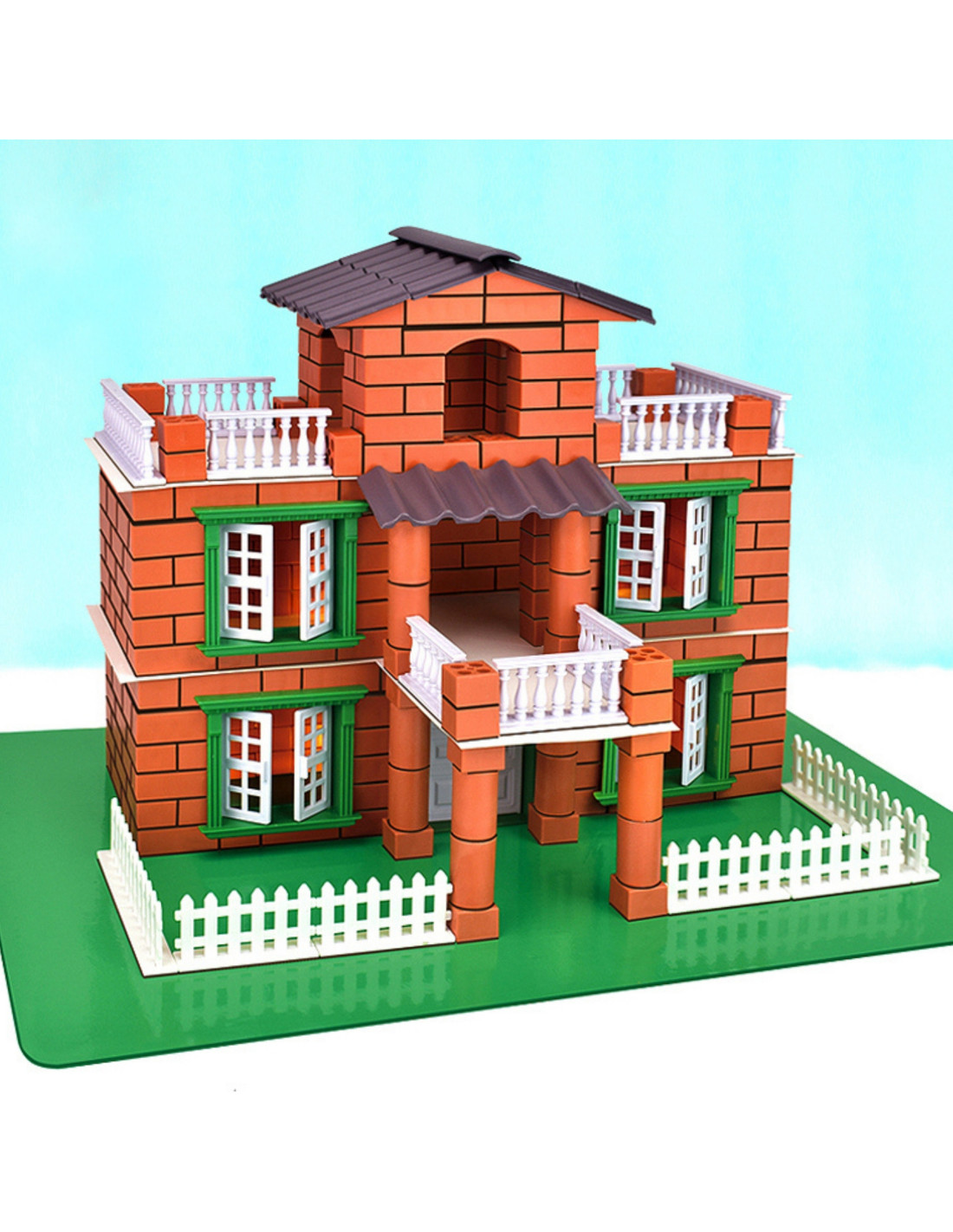 - - A large villa model with balconies, a terrace, a fence and movable windows, which looks impressive on a green base.