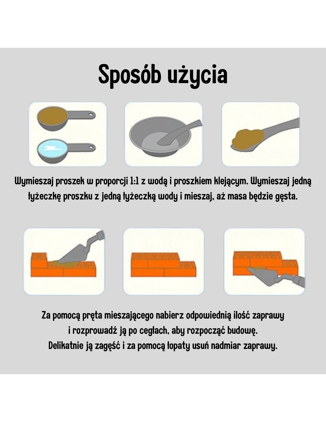 - - Intuitive method of use: mix powder with water 1:1, apply the mortar with a spatula and lay the bricks layer by layer.