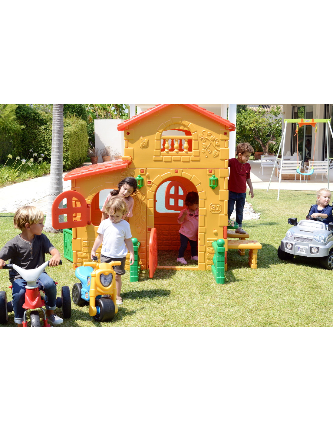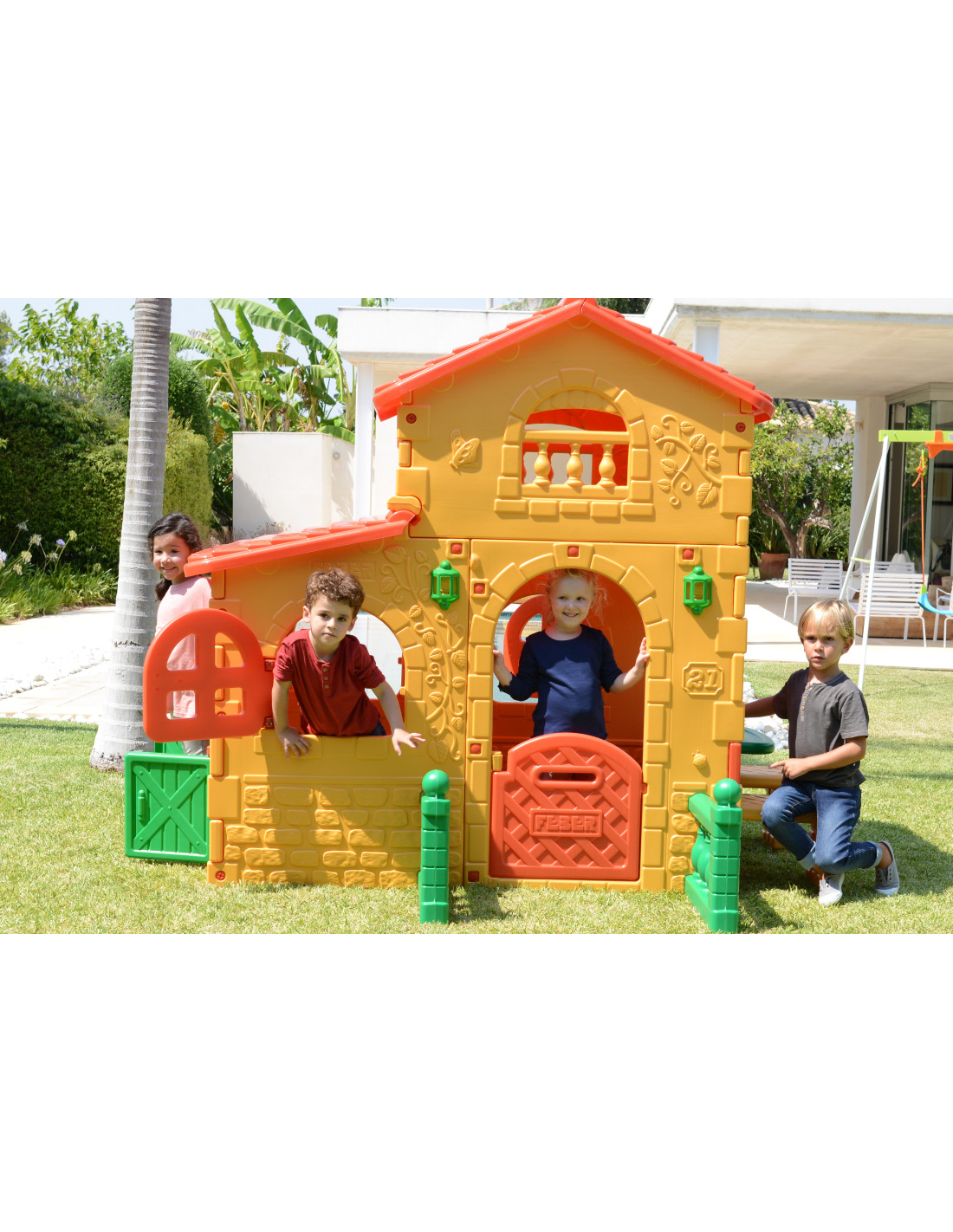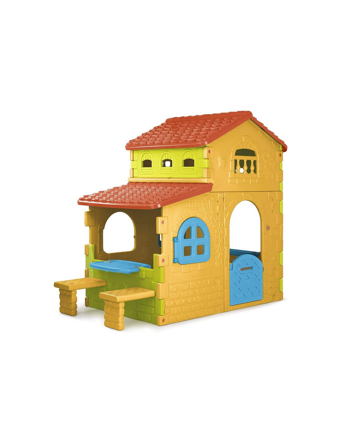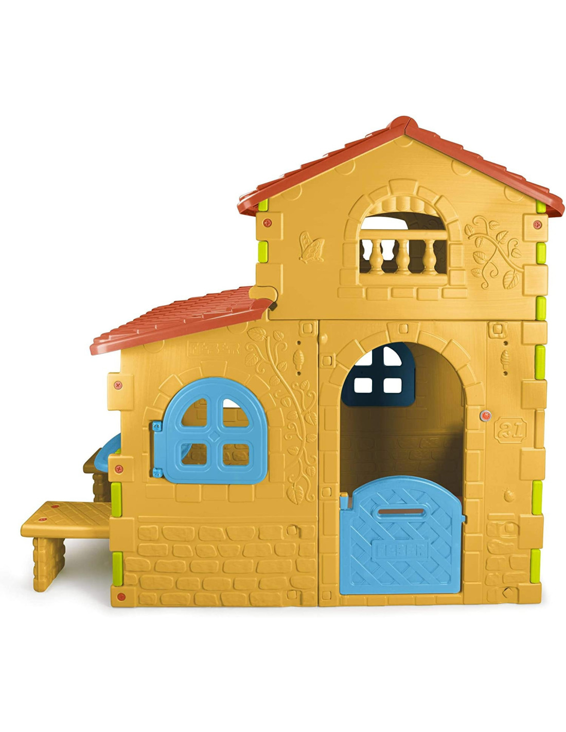 The Feber Super Villa is the largest and most entertaining playhouse, with ample interior space in two height zones. The entrance door features a slot that doubles as a mailbox, and there's also a doorbell. The house features brick and flower patterns on the walls. The house also includes a table and two benches for seating. The entire structure is made of a colorful, sun- and temperature-resistant plastic. The Feber Super Villa is incredibly easy to assemble.