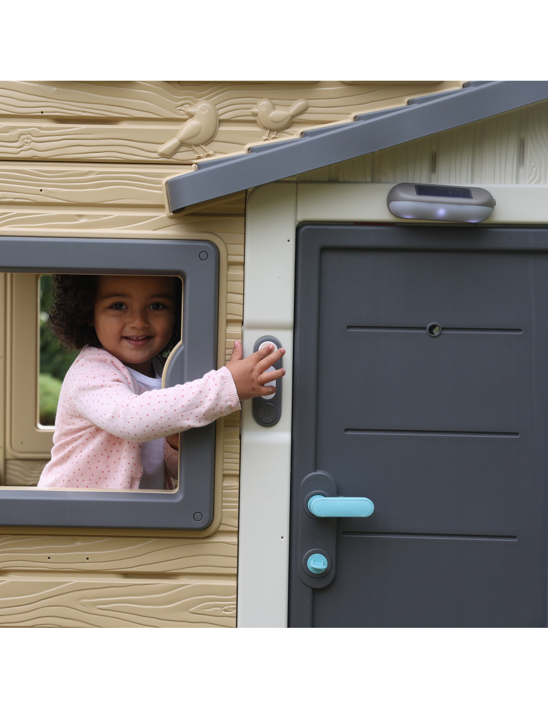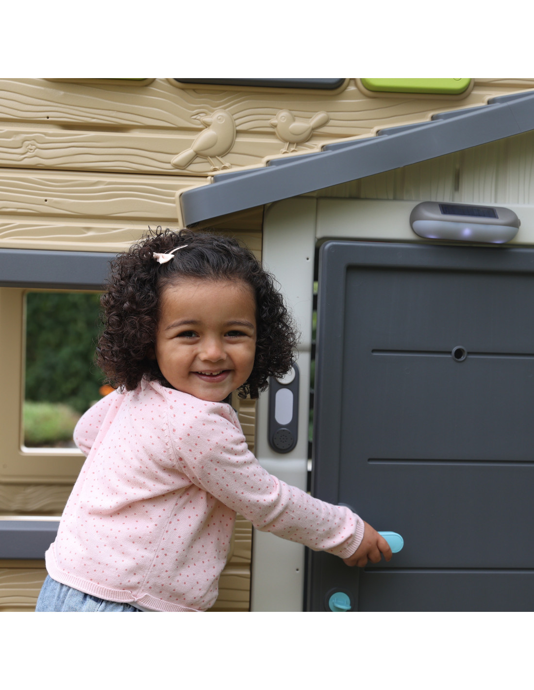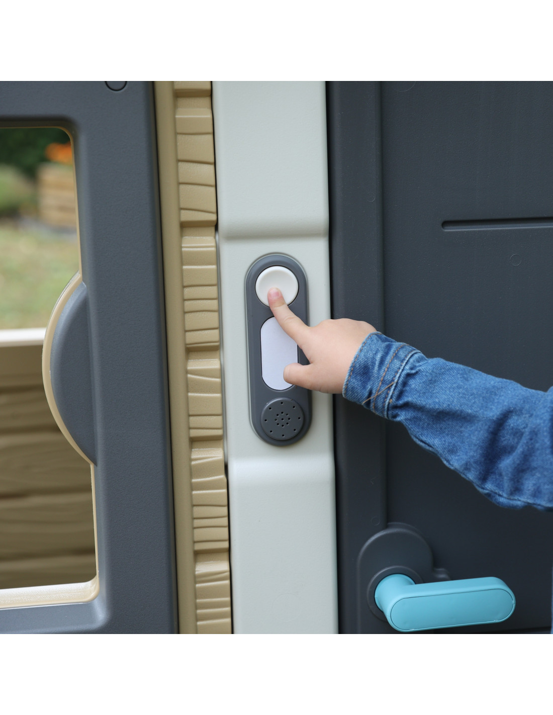 The Smoby Electronic Doorbell is a toy that fits all of the brand's modern garden houses: Jolie, Lovely, Nature, Pretty, Neo Jura Lodge, Friends House, Friends House Evo, 4 Seasons Playhouse, Sweety Corner Playhouse, Garden House Playhouse, Chef House Playhouse, and Stilt House . It's easy to assemble and allows children to personalize their house by writing their name on it. With the doorbell, children can invite guests into their home by hearing a realistic bell sound. The doorbell is gray and has a small speaker. It requires 2 AAA/LR03 batteries (not included).