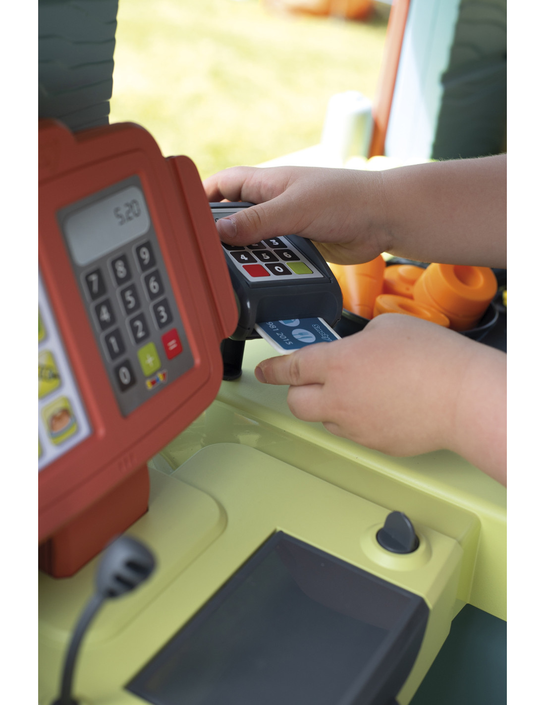 - - Functional kitchen: The cottage is equipped with a refrigerator, oven, gas stove, sink with faucet, and cash register with card reader. It's a real backstage area for restaurant play!