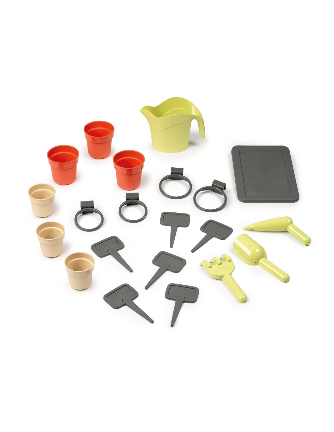 - - The set includes a 21-piece set of gardening accessories, including a watering can, rake, shovel, planter and plastic pot signs.