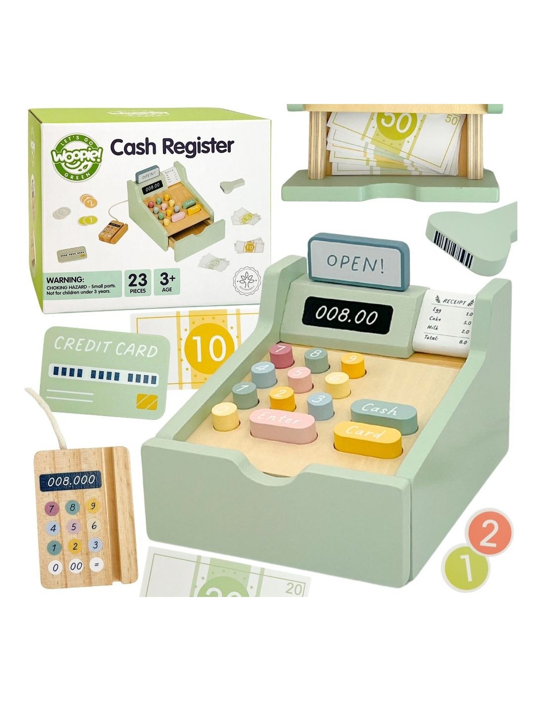 Let your child become a real shopkeeper with this charming wooden cash register from Woopie Green! It's not only a beautifully crafted toy in pastel colors, but above all, a gateway to countless hours of creative play. The set comes with everything you need to run your own shop – from a barcode scanner and payment terminal, to colorful banknotes, coins, and credit cards. Every element has been carefully thought out to ensure realistic and engaging play, allowing your child to feel like an adult while making everyday purchases.