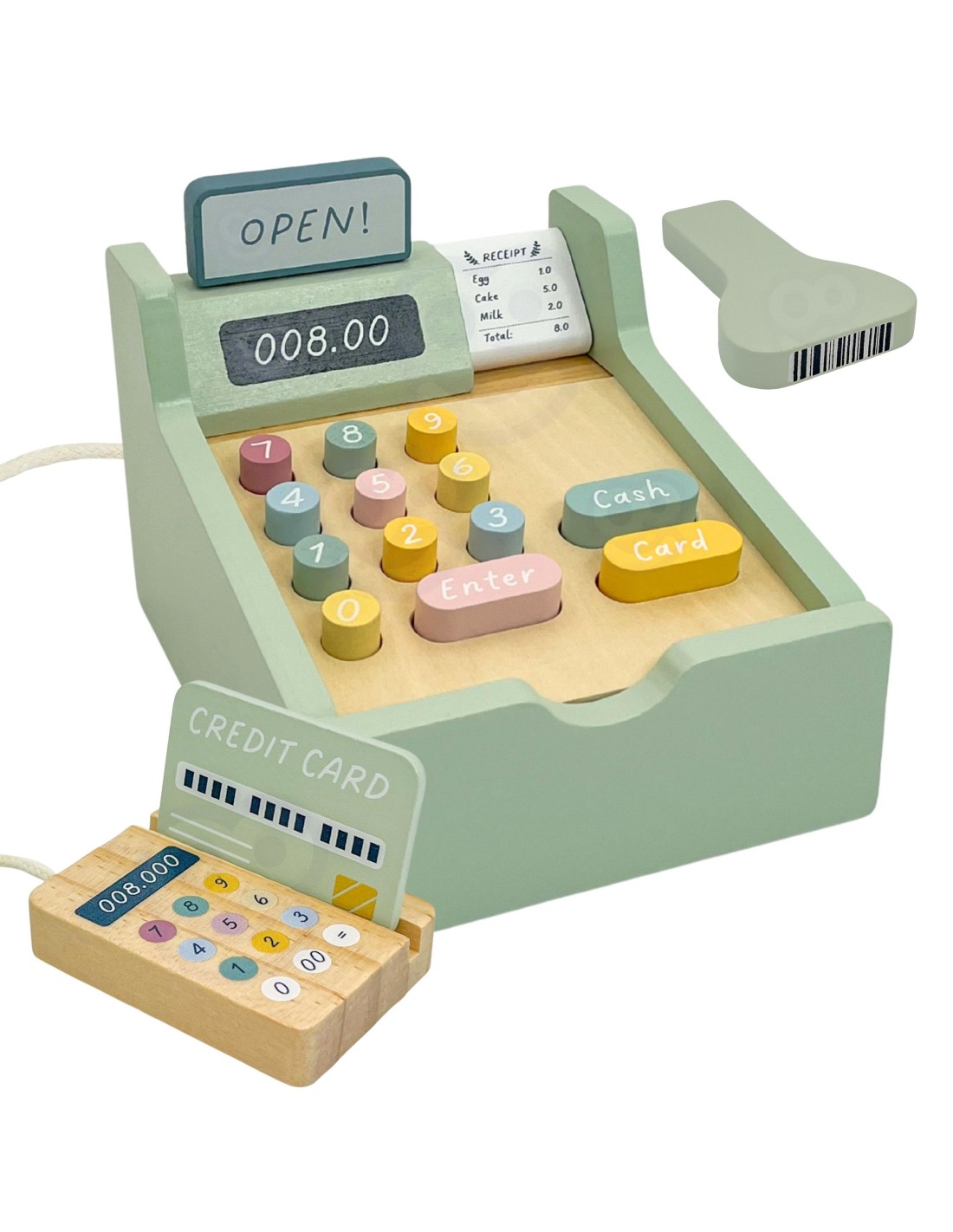 - - Motor Skills - The wooden cash register develops fine motor skills by manipulating the colorful buttons, coins, and banknotes. Children practice precise hand movements using the scanner, opening and closing the drawer, pressing buttons, and counting money. Placing and inserting a credit card into the reader further strengthens hand-eye coordination.