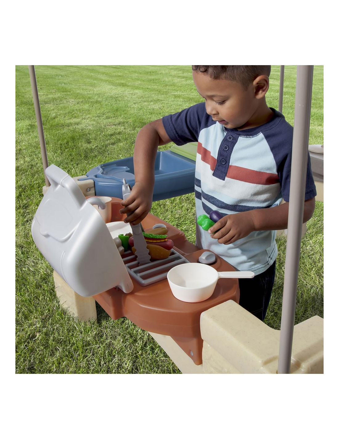 Patio z Baldachimem i grillem amerykańskiego producenta zabawek Step2 to świetny dodatek do przydomowego placu zabaw. Dzieci mogą organizować własne przyjęcia dla swoich znajomych. Realistyczne i atrakcyjne wzornictwo idealnie wkomponuje się do każdego ogrodu. Mali kucharze będą mogli godzinami bawić się w kuchni, udając że przygotowują i grillując swoje ulubione potrawy, zupełnie jak mama i tata.