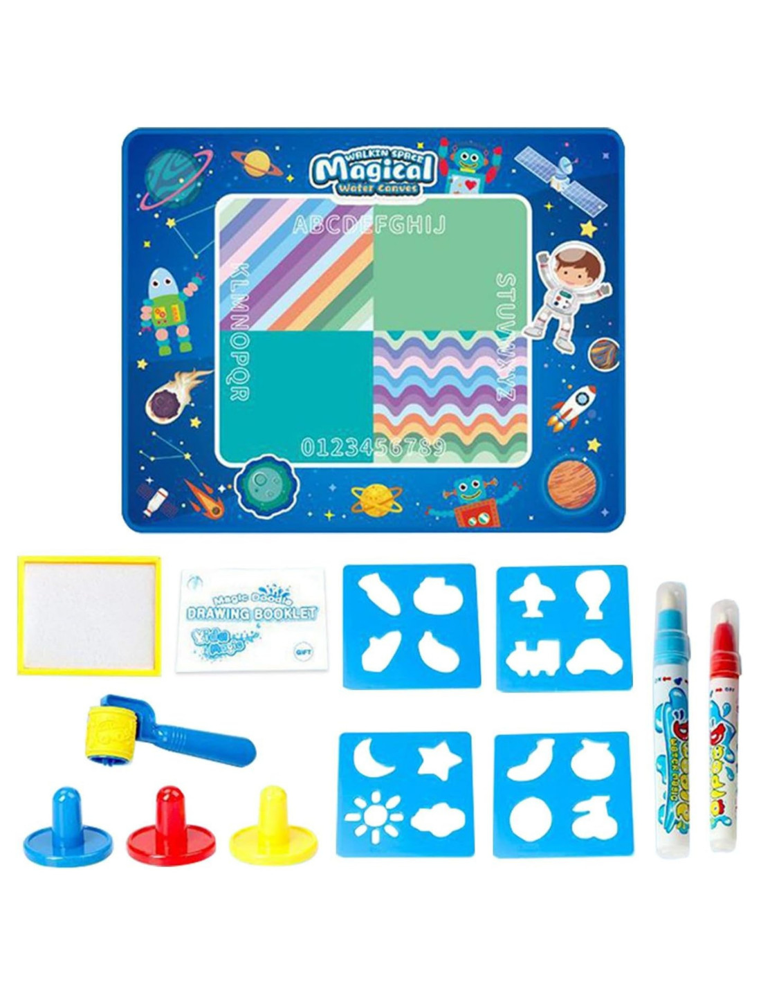 The Woopie Water Mat is an innovative educational toy that allows children to create drawings using only water – without mess or the risk of staining. After a few minutes, the drawings gradually disappear, giving your child the opportunity to create new works of art without limits . The large painting surface and extensive accessories provide hours of safe, creative play at home or at preschool. The mat's space theme, featuring planets, robots, rockets, and astronauts, turns ordinary drawing into a journey through the galaxy, stimulating your child's imagination. The mat improves manual dexterity and hand-eye coordination. and is a great way to learn through play. It can be used both at home and in the garden.