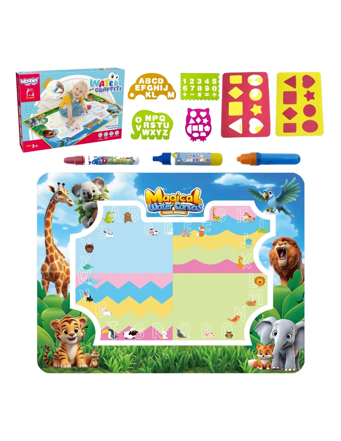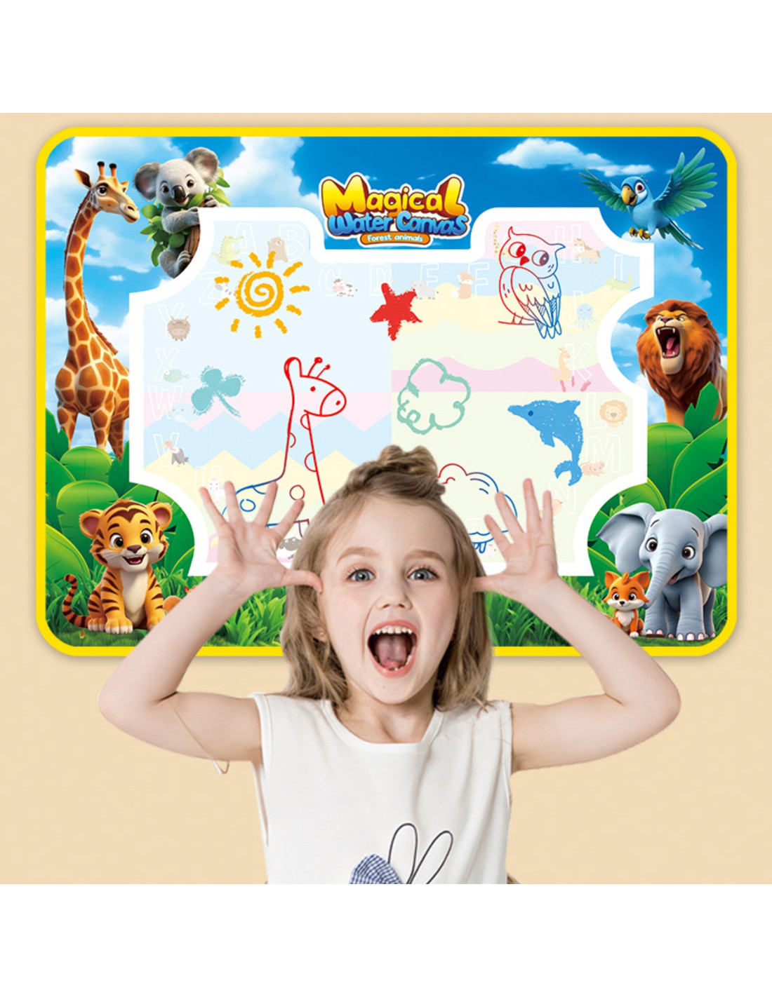 The WOOPIE Water Painting Mat is an educational art kit for children aged 3 and up . Simply fill the included markers with clean water to discover colors, letters, numbers, and shapes without the use of ink or paint. The drawings appear briefly and disappear once dry, inviting you to play again. The large 100x75 cm format provides space for collaborative creation, and the playful jungle animal graphics encourage learning through play.