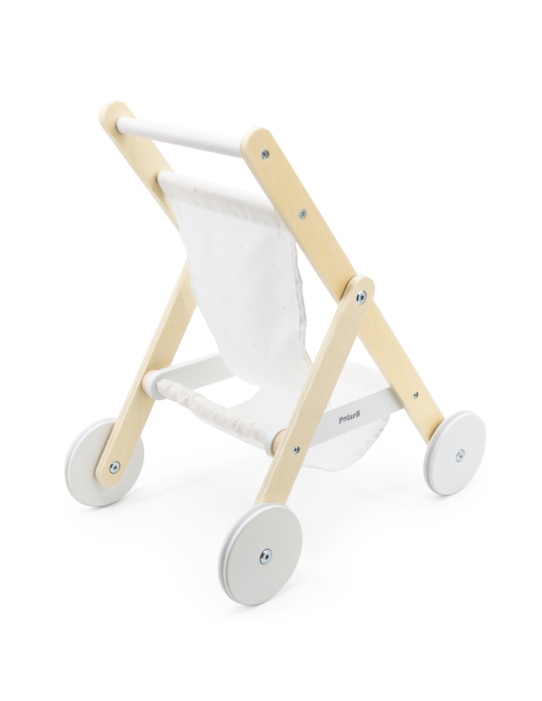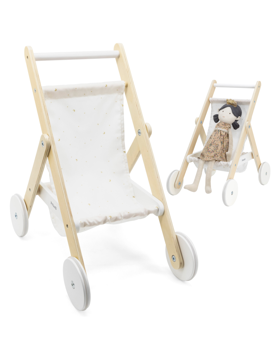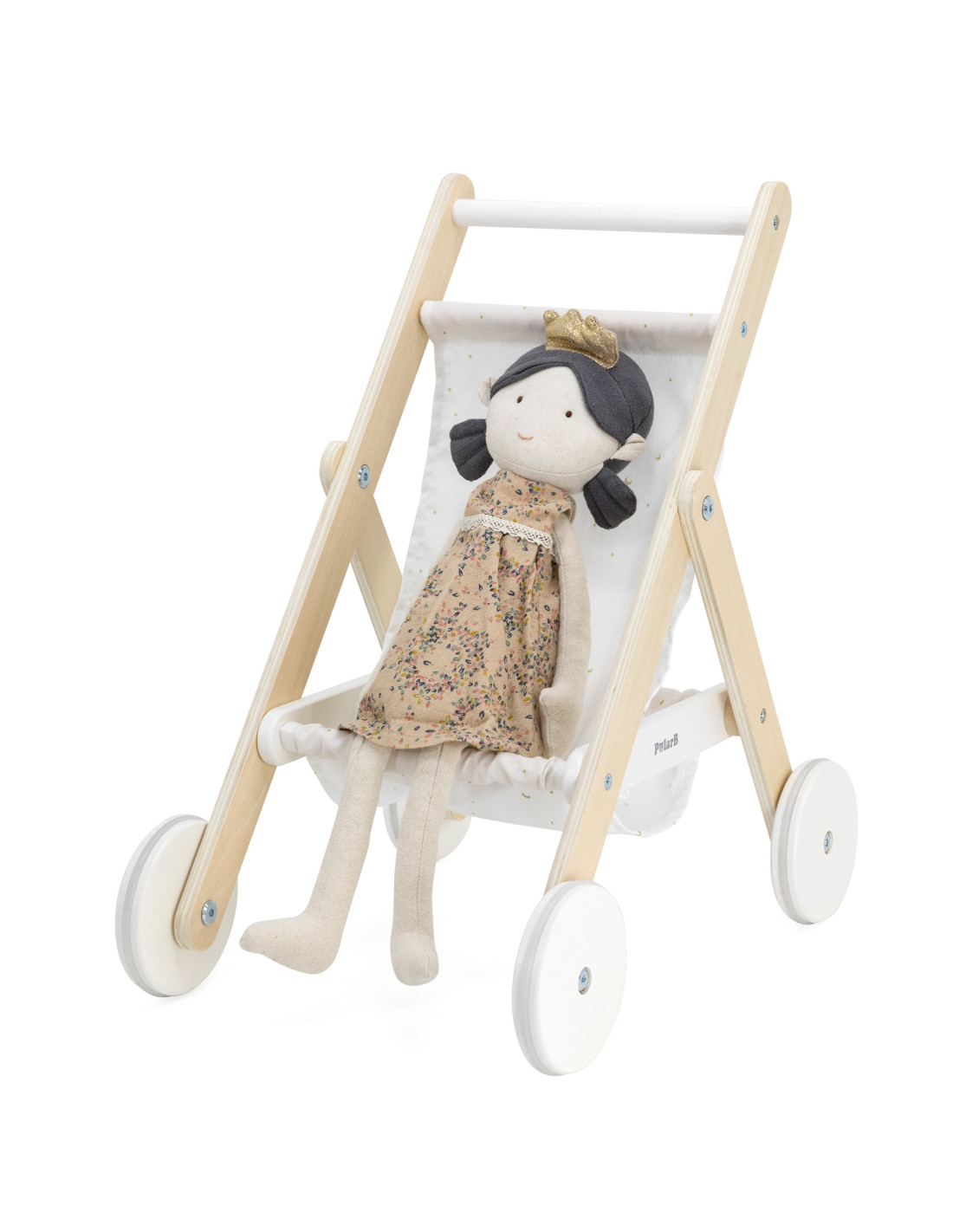 Take your favorite doll or teddy bear for a stroll in the PolarB wooden stroller from VIGA . The stroller features a sturdy wooden frame, a fabric print with stars and a moon , and a handy basket underneath for storing accessories. Rubber wheels are added for added protection and noise reduction, as well as for little ones to walk with stability and confidence. It fits dolls up to 38 cm tall.