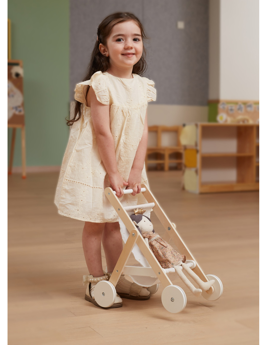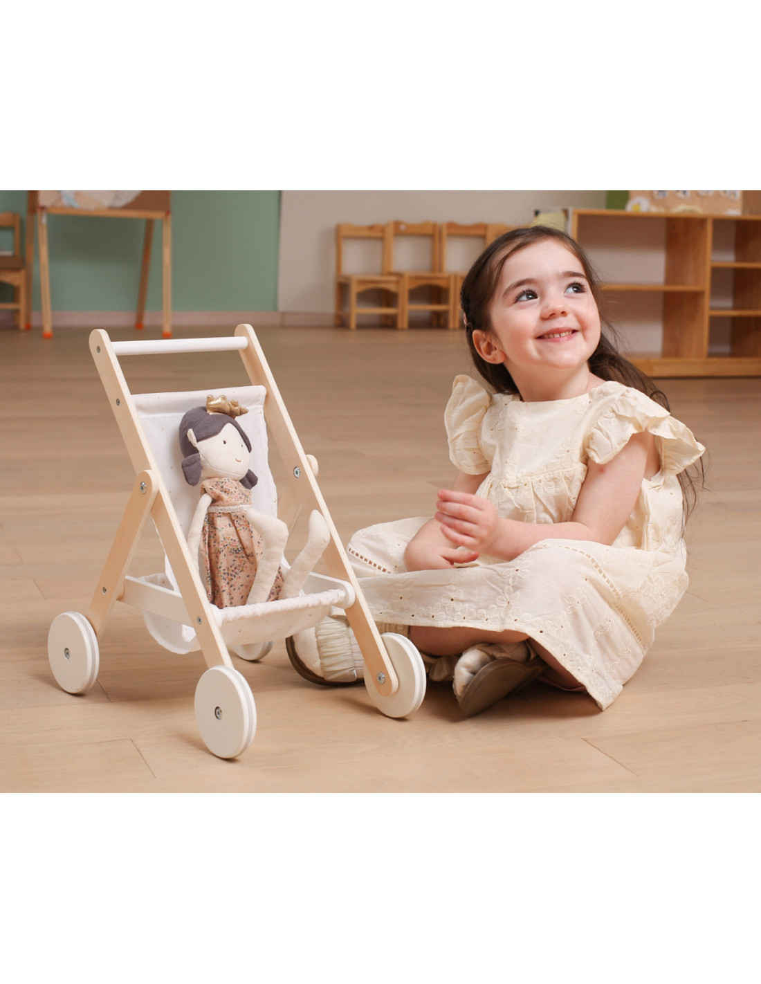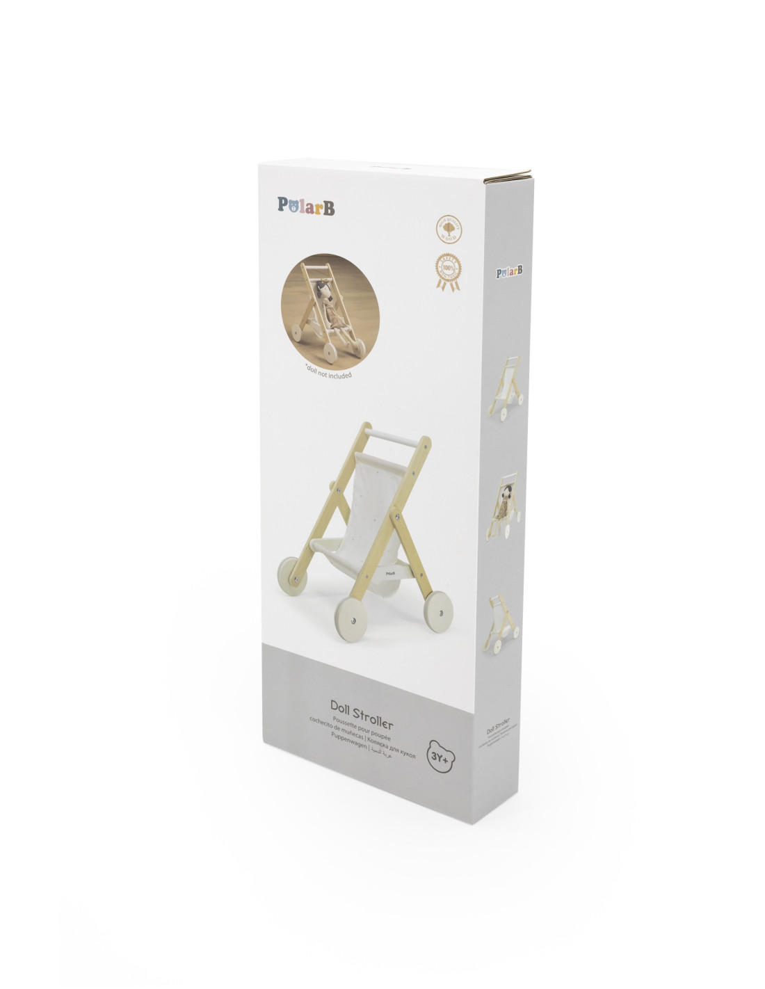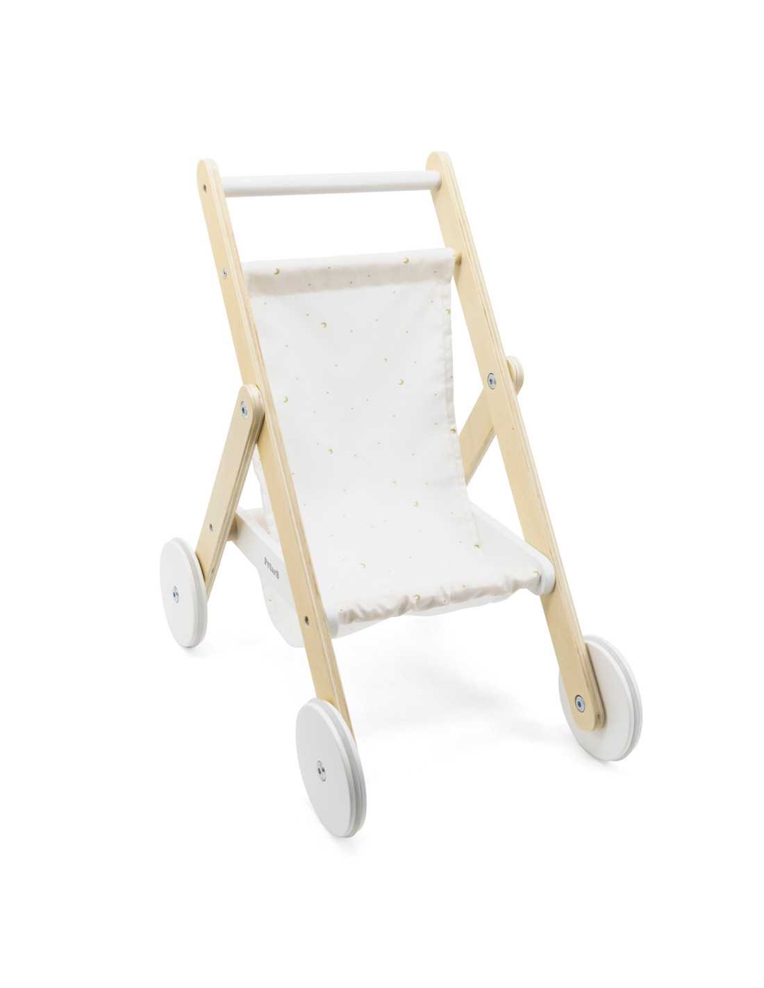 Take your favorite doll or teddy bear for a stroll in the PolarB wooden stroller from VIGA . The stroller features a sturdy wooden frame, a fabric print with stars and a moon , and a handy basket underneath for storing accessories. Rubber wheels are added for added protection and noise reduction, as well as for little ones to walk with stability and confidence. It fits dolls up to 38 cm tall.