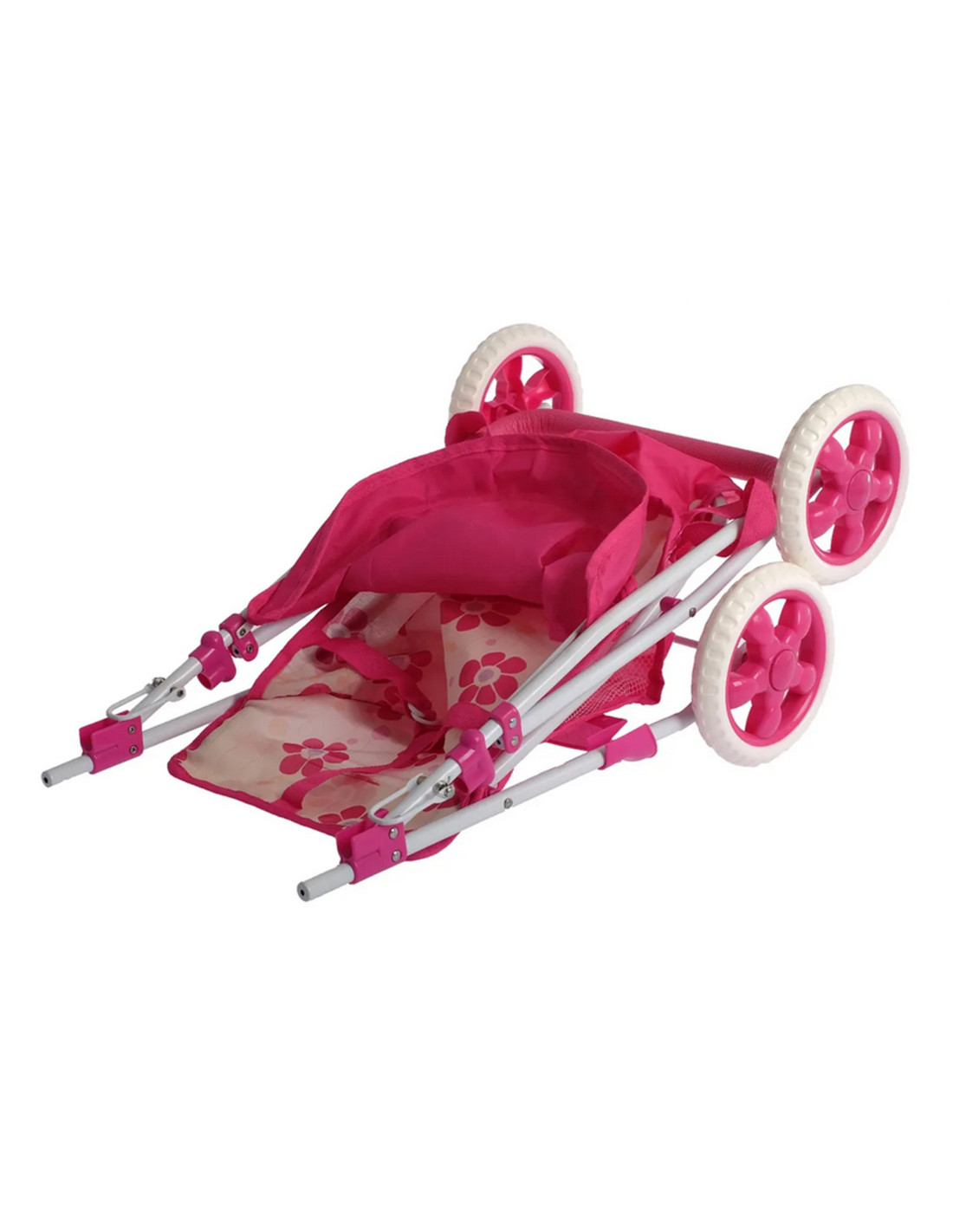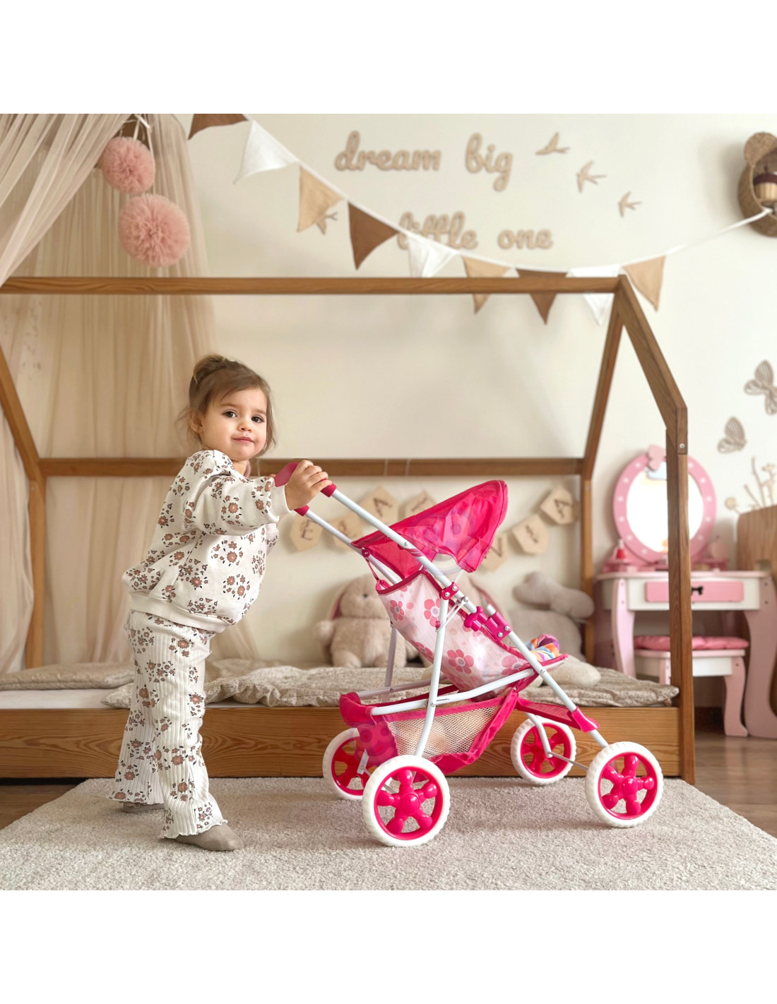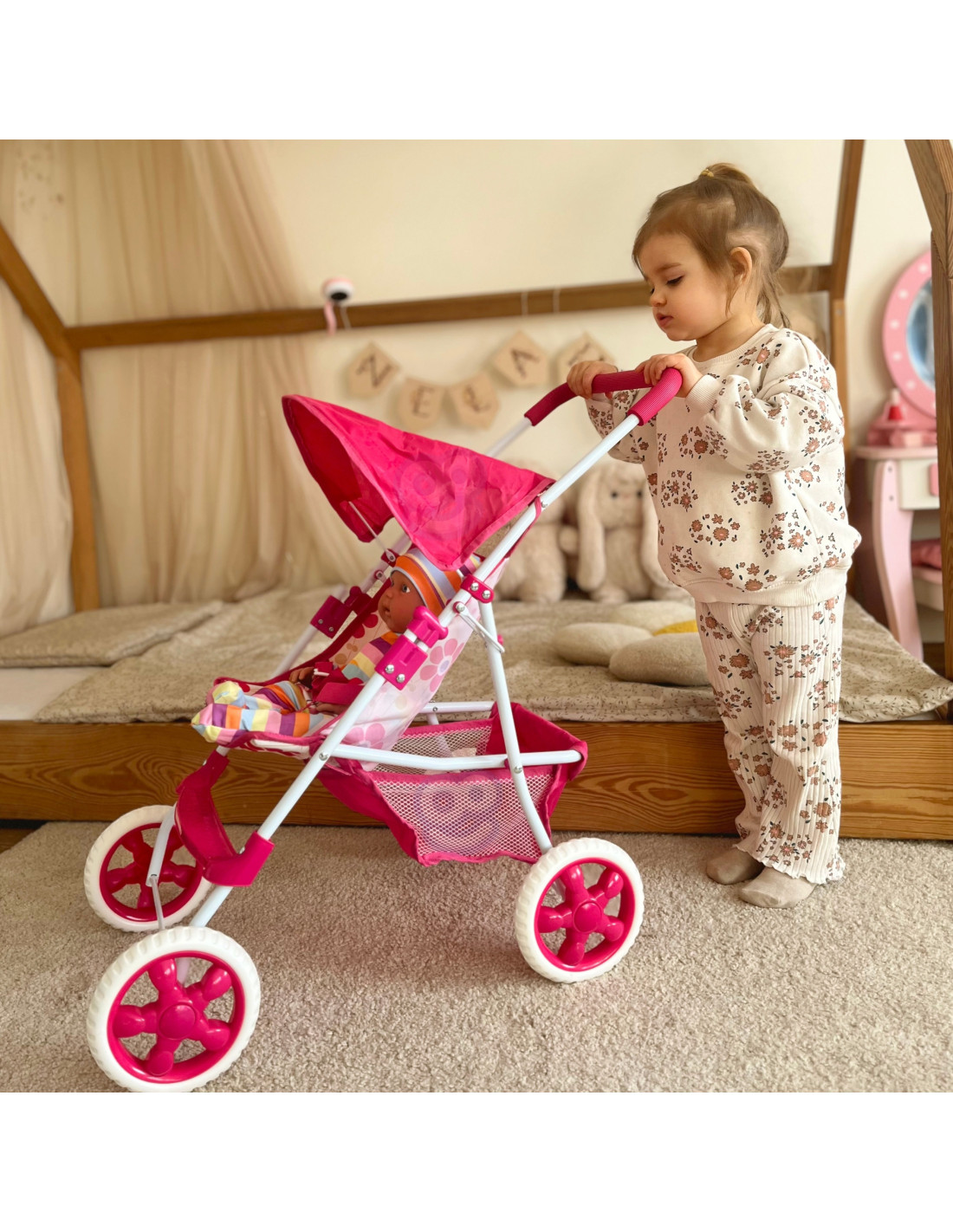 The Woopie doll stroller is the perfect choice for any little girl who loves playing house. It boasts a lightweight yet very stable frame, ensuring comfort and safety during use. Equipped with a footrest, a sun canopy, safety harnesses, and a practical basket for small items, it guarantees full functionality and comfort. It also features a soft handle for easy maneuvering and quiet, grippy foam wheels, perfect for both home and walks. When playtime is over, the stroller folds easily, saving space during storage. The stylish design makes it a unique addition to any doll's collection.