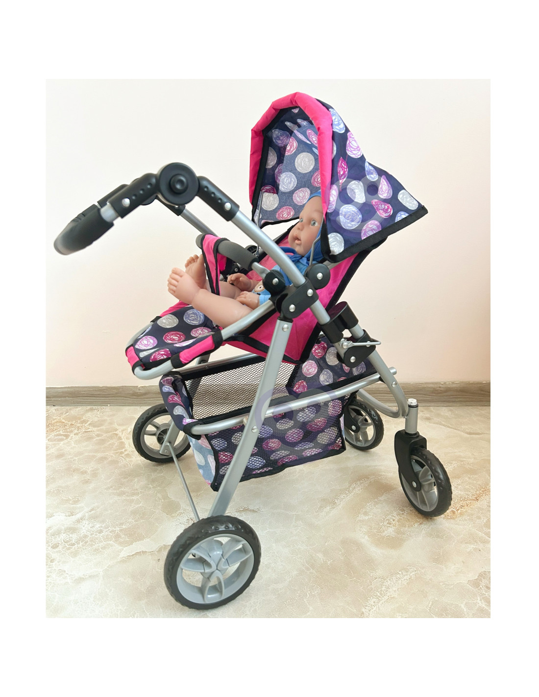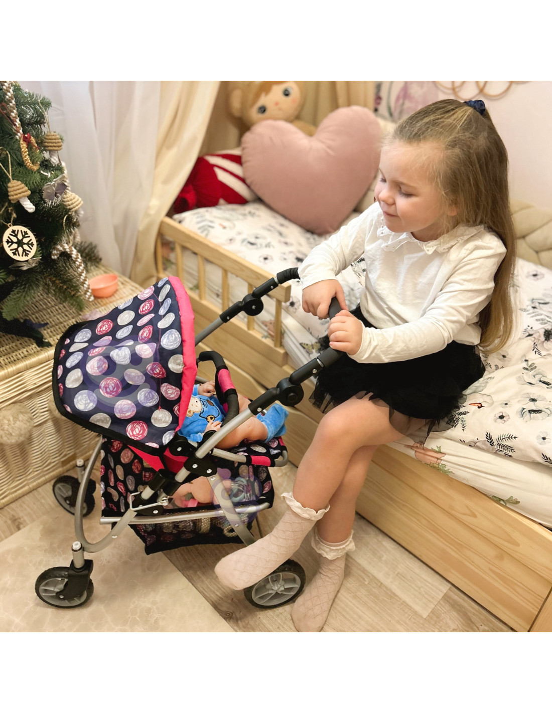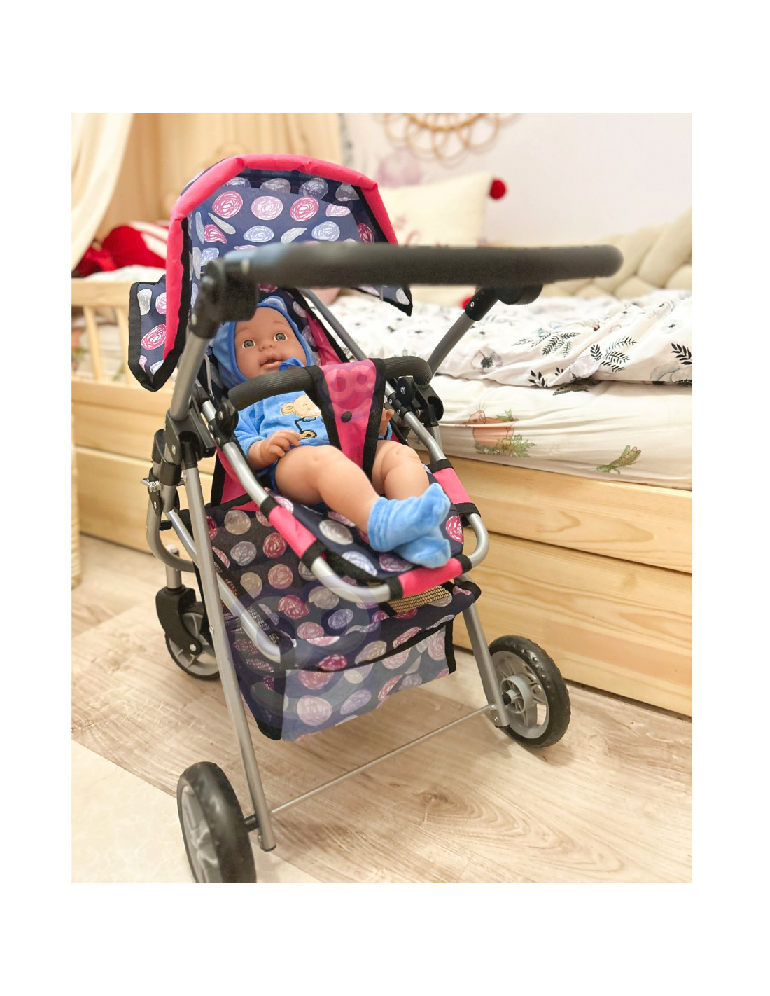 This stylish and functional doll stroller from WOOPIE is the perfect gift for any little doll lover. Its adjustable seat allows you to easily adapt it to various play needs, allowing you to transport your favorite dolls. Swivel front wheels ensure smooth maneuverability, and the sturdy construction ensures stability during walks. The stroller is equipped with a soft, comfortable handle and a spacious accessory basket that holds all the essentials for playtime. The foldable canopy protects the dolls from the sun, and the compact design makes it easy to store when playtime is over.