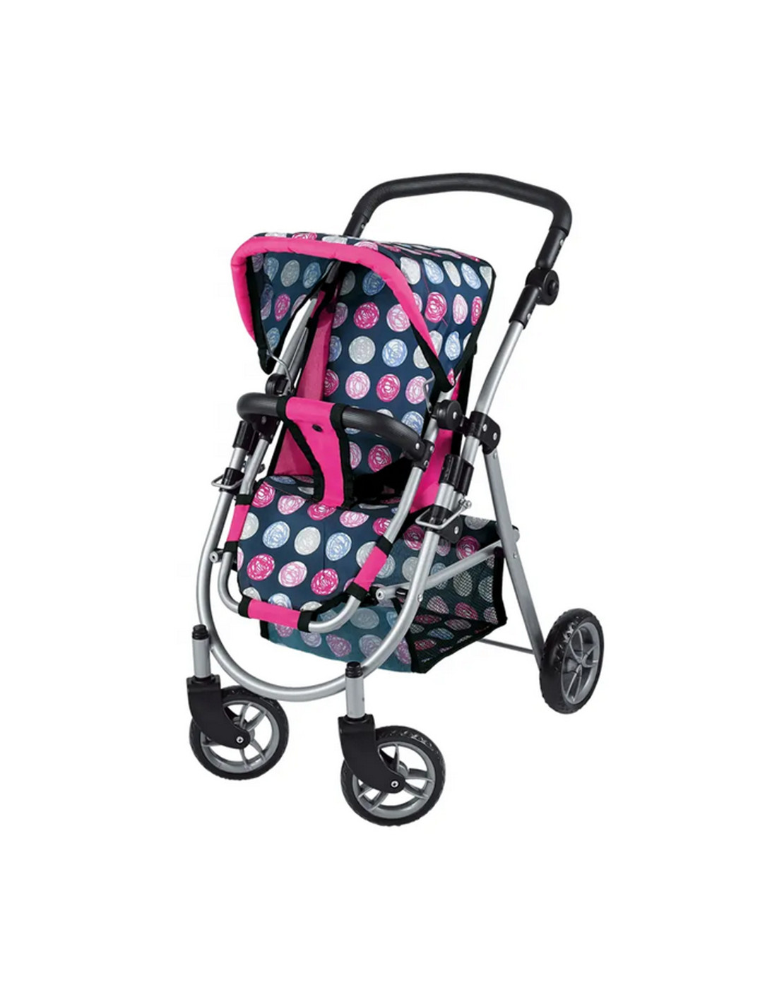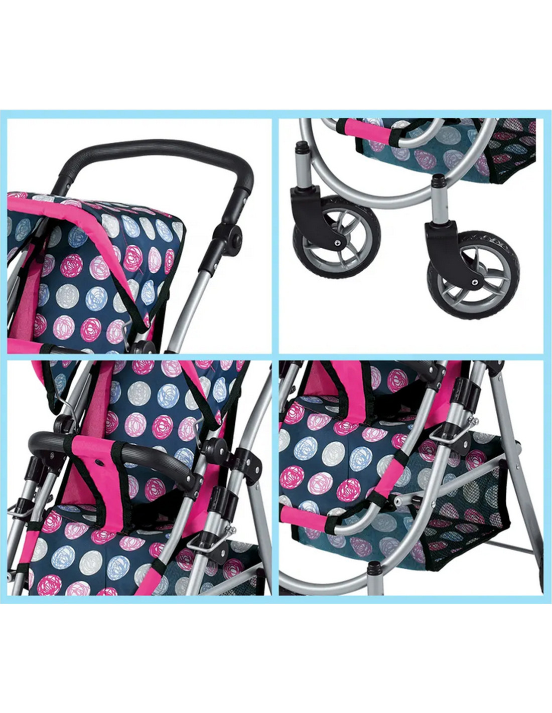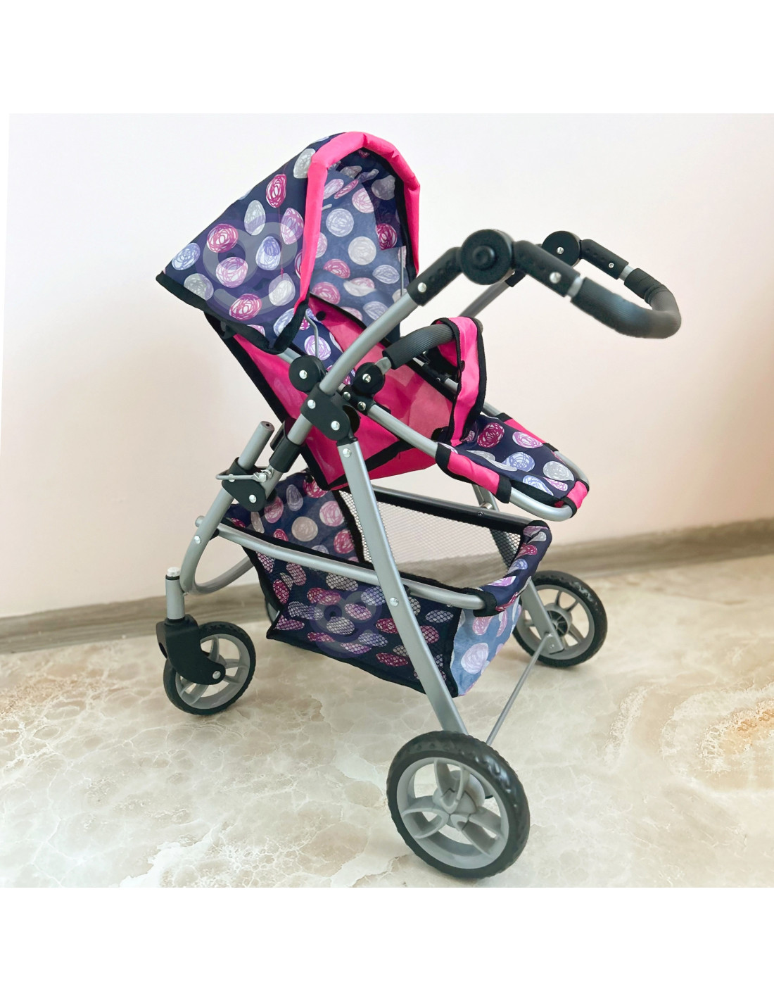 This stylish and functional doll stroller from WOOPIE is the perfect gift for any little doll lover. Its adjustable seat allows you to easily adapt it to various play needs, allowing you to transport your favorite dolls. Swivel front wheels ensure smooth maneuverability, and the sturdy construction ensures stability during walks. The stroller is equipped with a soft, comfortable handle and a spacious accessory basket that holds all the essentials for playtime. The foldable canopy protects the dolls from the sun, and the compact design makes it easy to store when playtime is over.