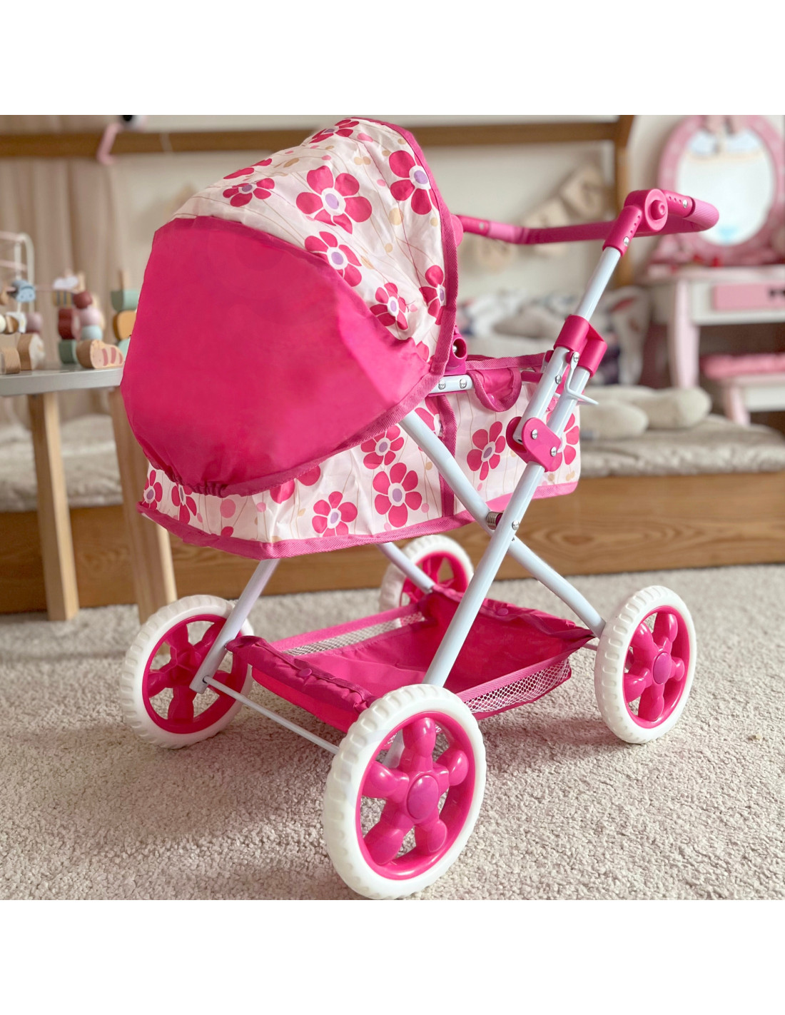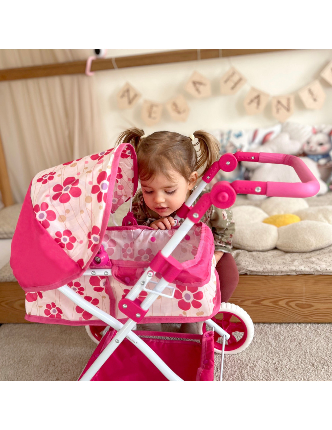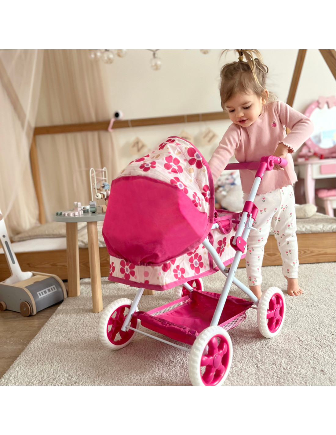 This stylish, deep, and functional doll stroller from WOOPIE with a floral pattern is the perfect choice for any little doll lover! The stroller has an adjustable handle, allowing it to grow with your child. Its quiet wheels ensure smooth maneuverability, and its stable construction ensures safe play.