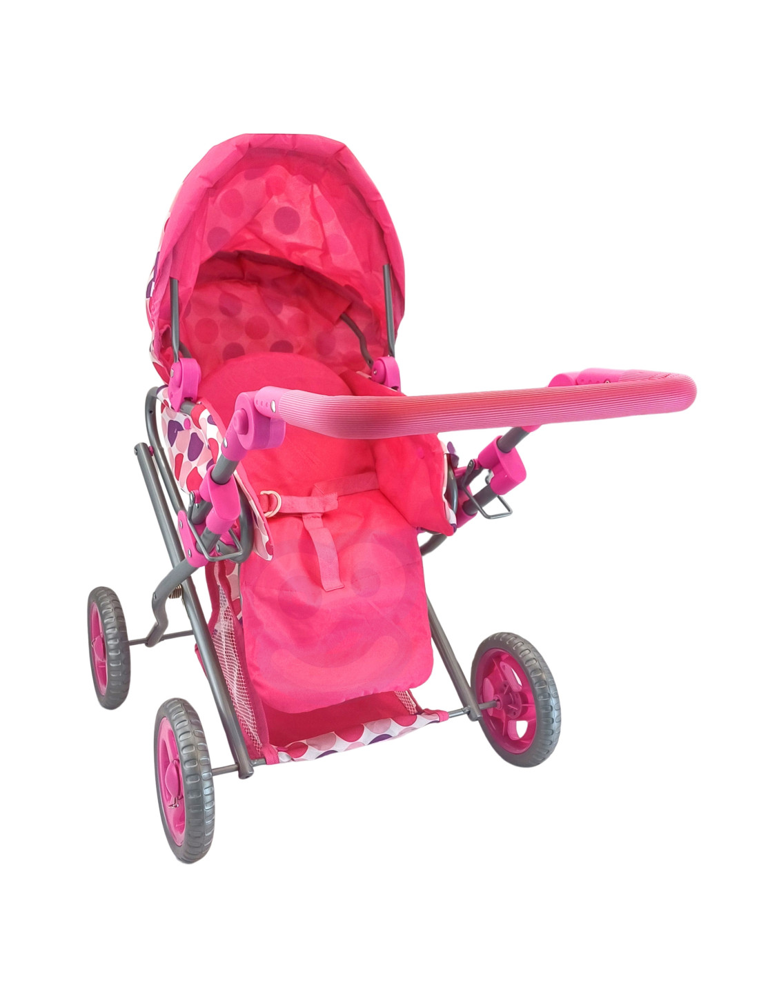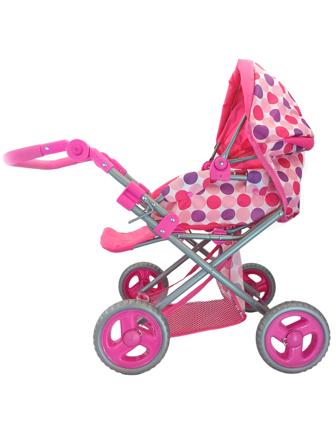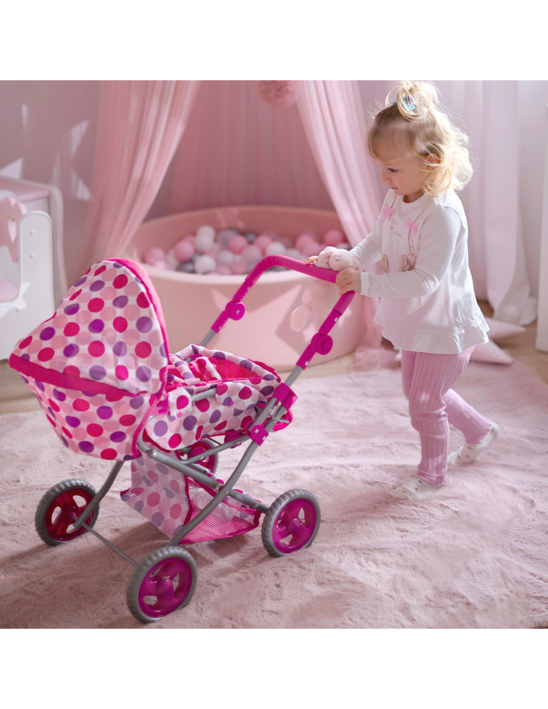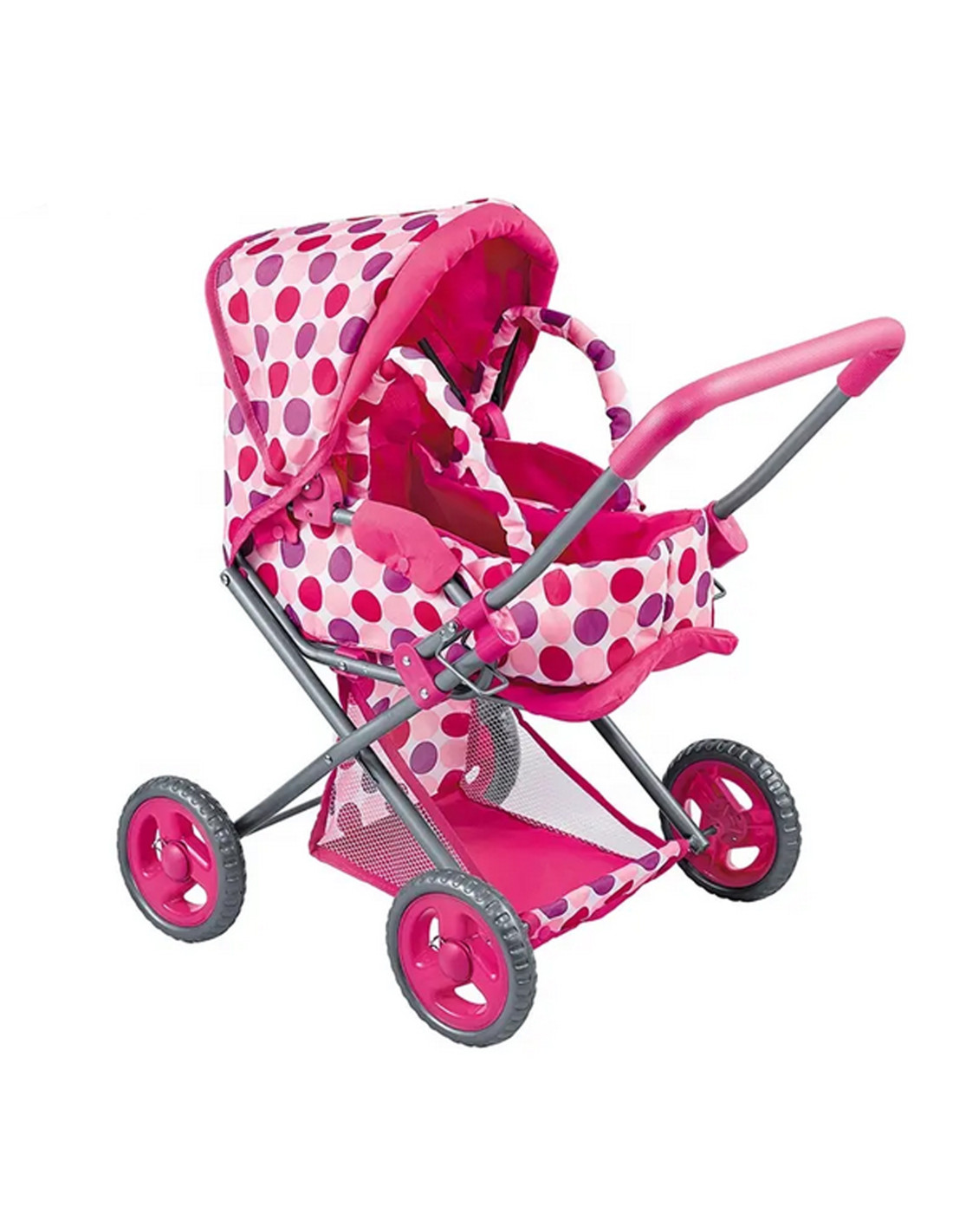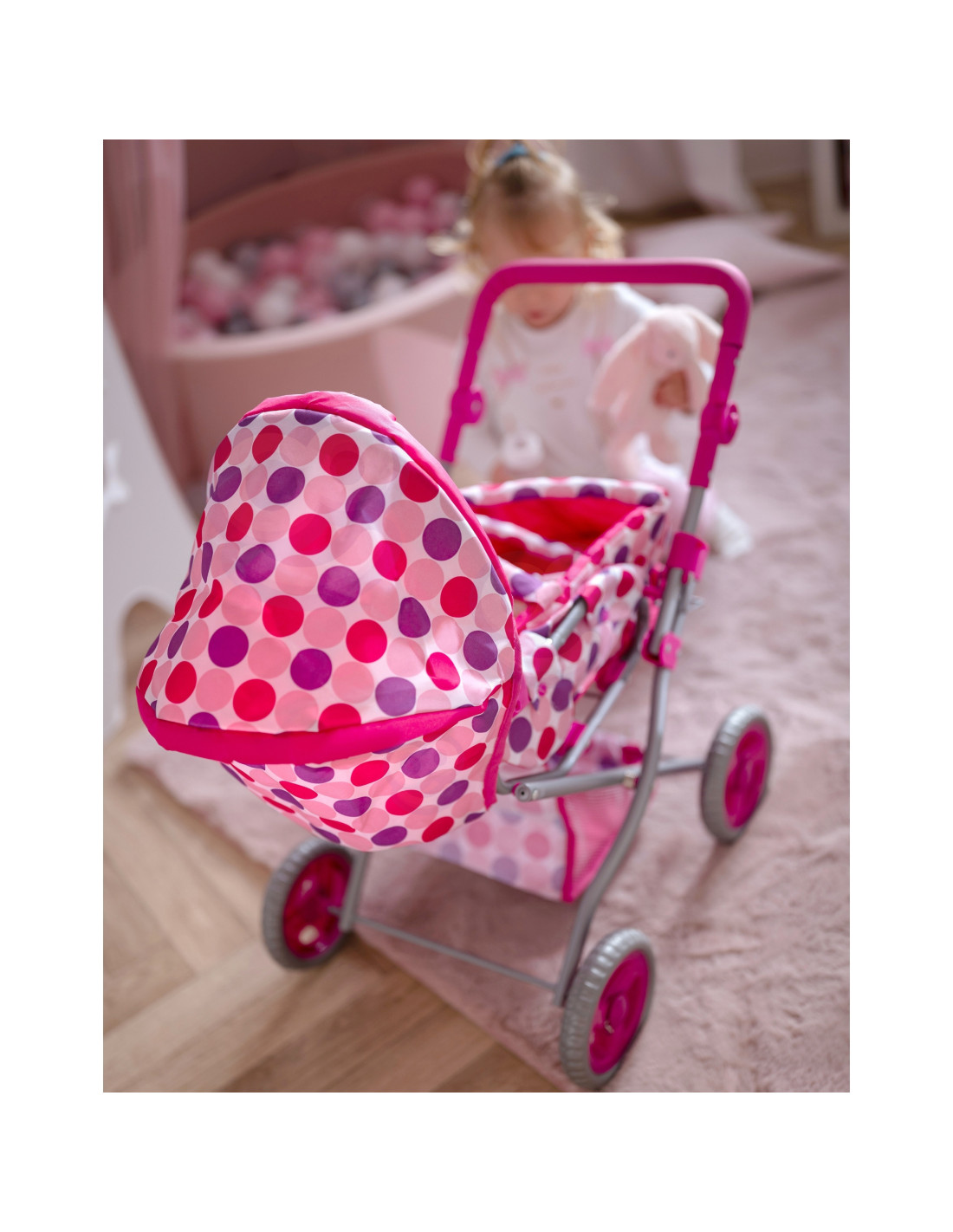 This stylish and functional doll stroller from WOOPIE ROYAL in pink polka dots is the perfect choice for any little doll lover! The stroller features an adjustable handle, allowing it to be adjusted to your child's height. Its quiet wheels ensure smooth maneuverability, and its stable construction ensures safe play. Additionally, the stroller converts into a pushchair, and thanks to a removable section, it can also be used as a carrier or a bag. The stroller features a canopy that can be extended and closed, and a spacious basket for small items.