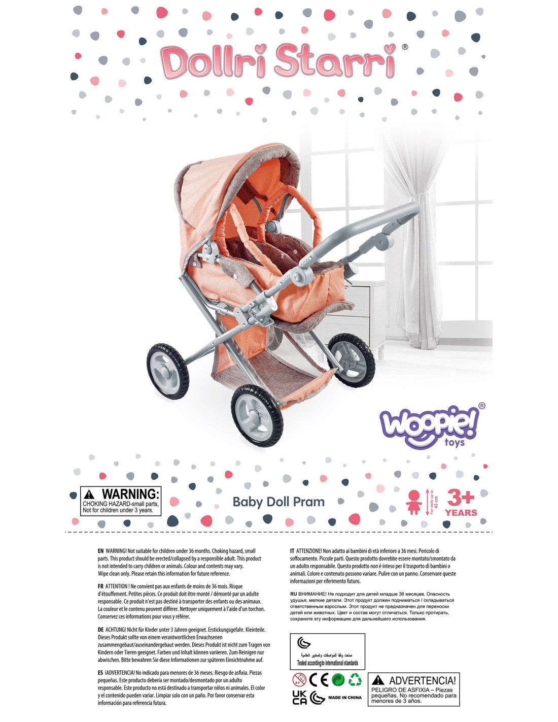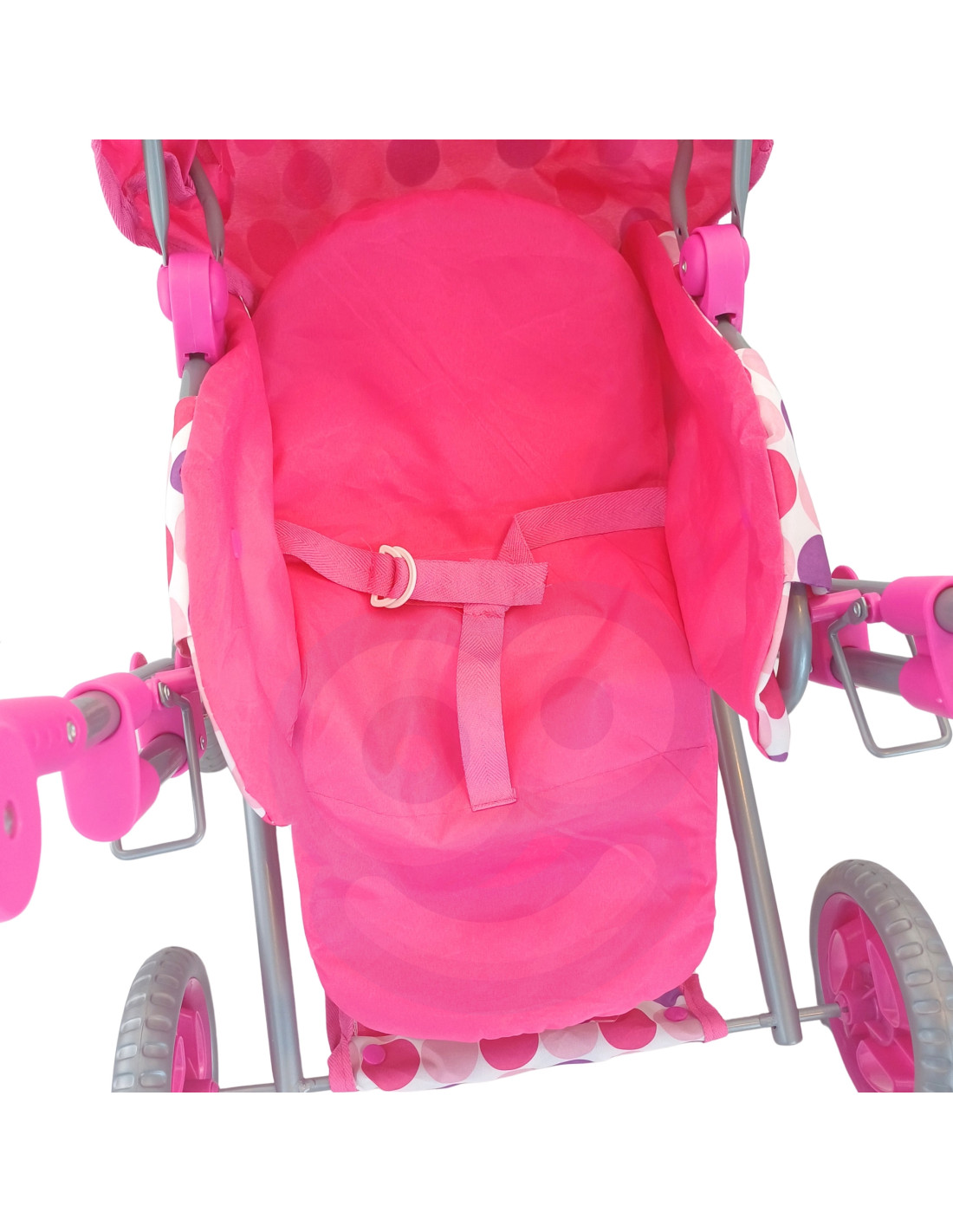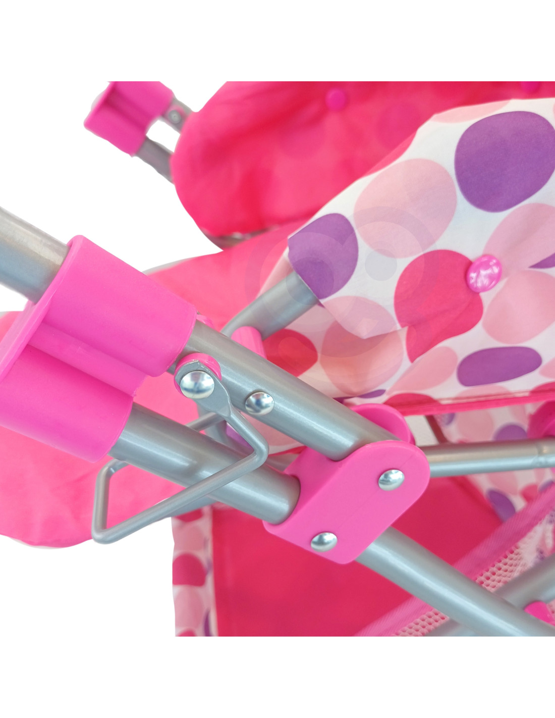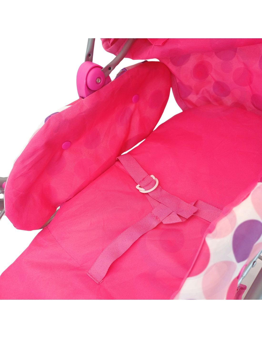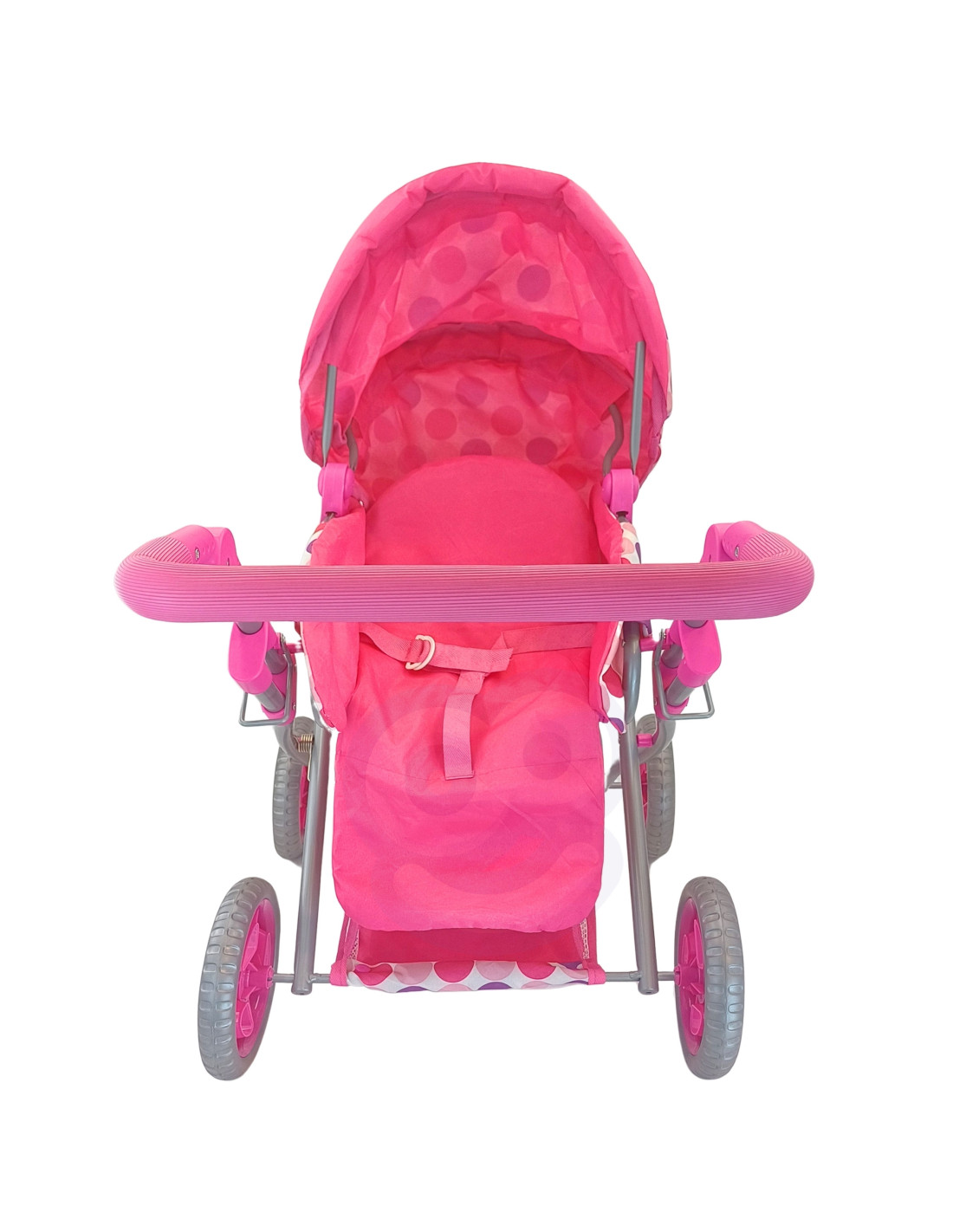 This stylish and functional doll stroller from WOOPIE ROYAL in pink polka dots is the perfect choice for any little doll lover! The stroller features an adjustable handle, allowing it to be adjusted to your child's height. Its quiet wheels ensure smooth maneuverability, and its stable construction ensures safe play. Additionally, the stroller converts into a pushchair, and thanks to a removable section, it can also be used as a carrier or a bag. The stroller features a canopy that can be extended and closed, and a spacious basket for small items.