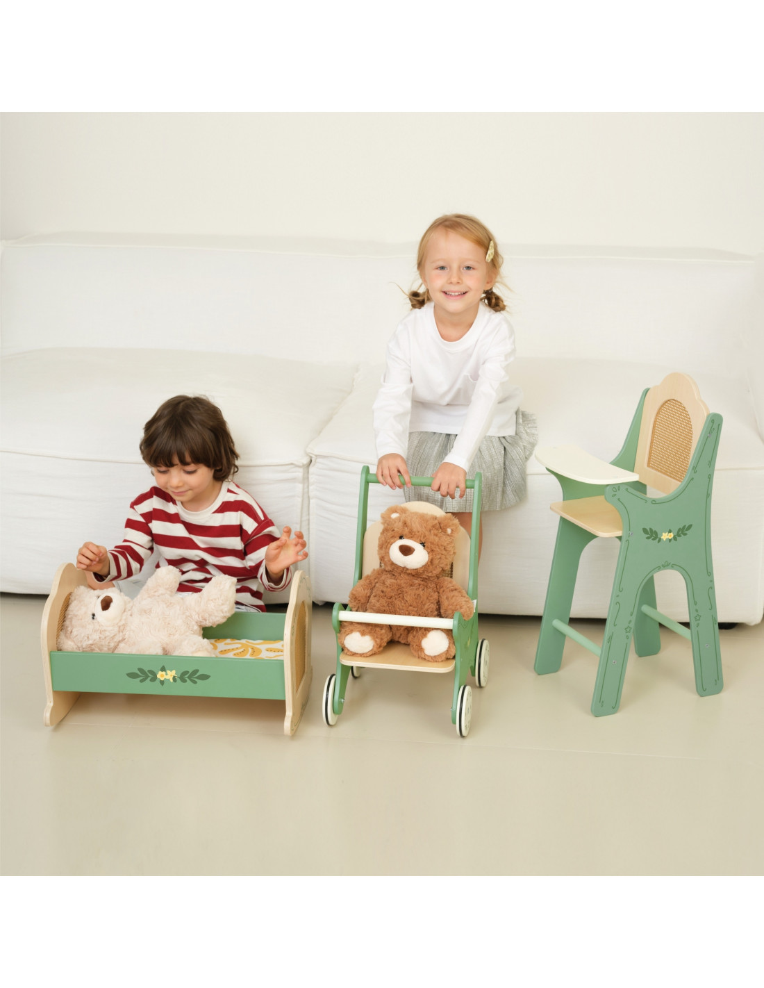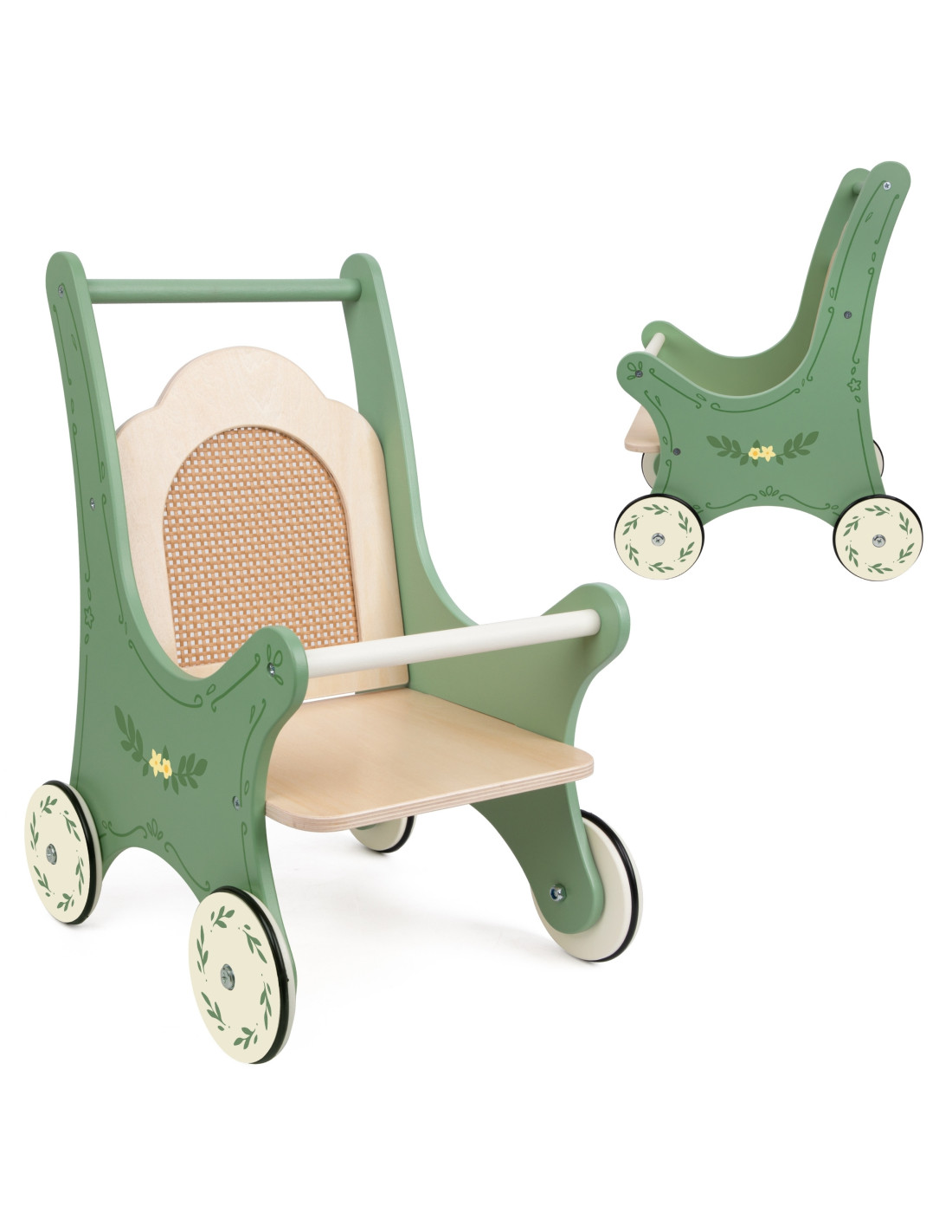This charming doll stroller combines classic style with natural materials. Its green design with floral embellishments and rattan backrest attracts attention and creates a unique retro atmosphere. It's the perfect toy for children who enjoy role-playing and caring for their dolls and stuffed animals.