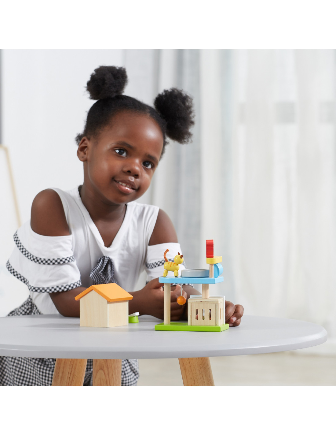 This wooden animal set is the perfect addition to any dollhouse. The set includes a variety of animals—an adorable puppy, a kitten, a bunny, a parrot—along with their houses and a mini playground. Children love making up stories, and this set is a great way to spark their imaginations.