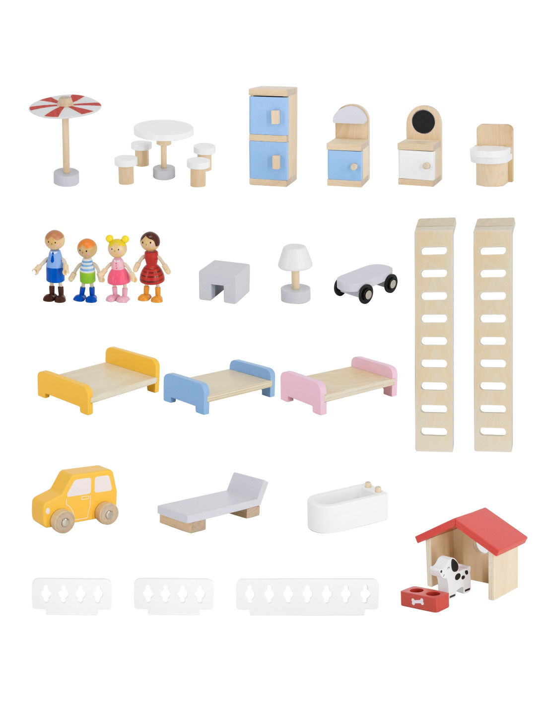 The house is fully furnished and equipped with essential accessories. Your child will find everything they need to create their own fairytale world: a kitchen, living room, bathroom, cozy bedroom, children's room, garage, balcony, and even a doghouse! Each room has been carefully designed and equipped with furniture and accessories. The set encourages creative play, develops imagination, and develops social skills.