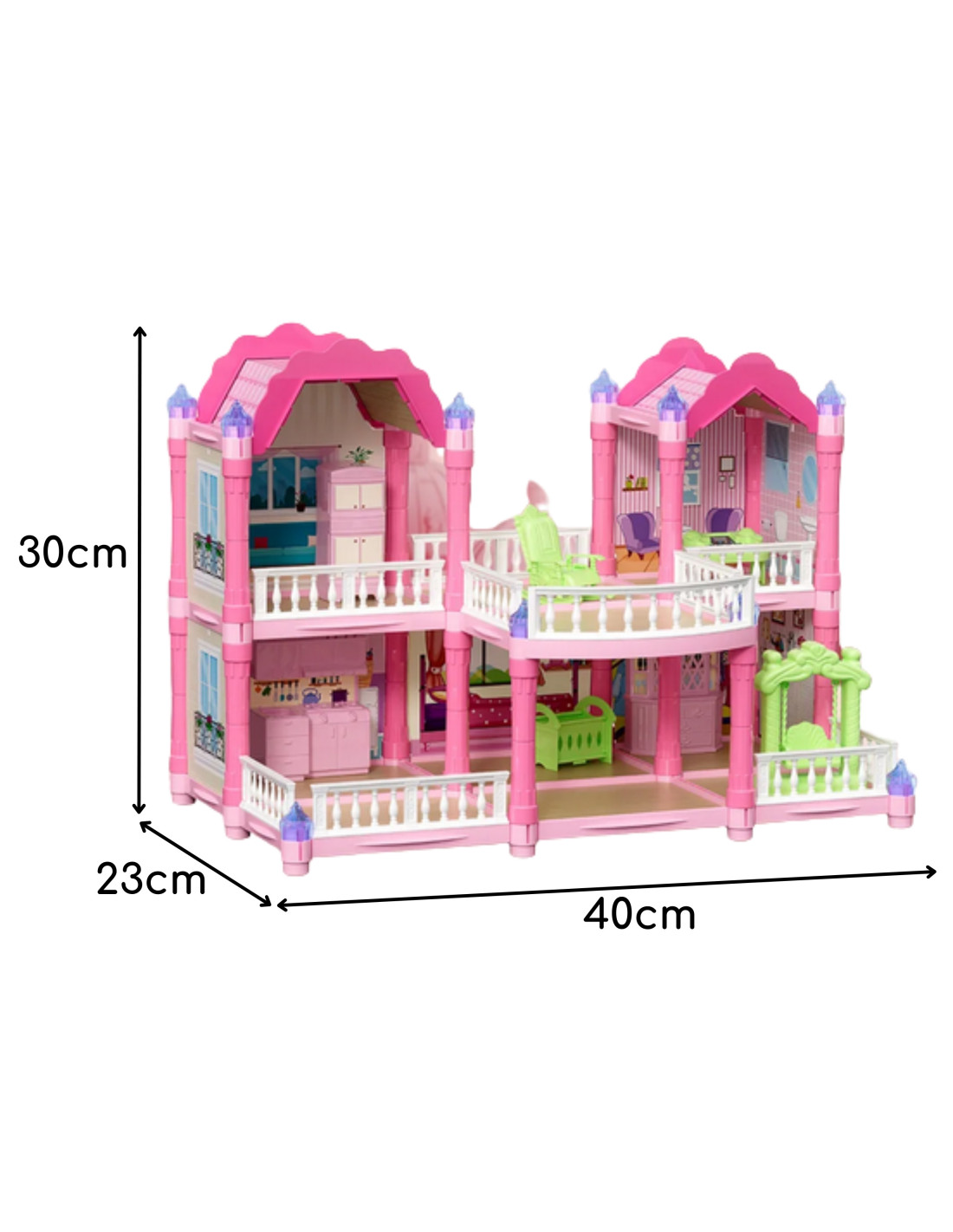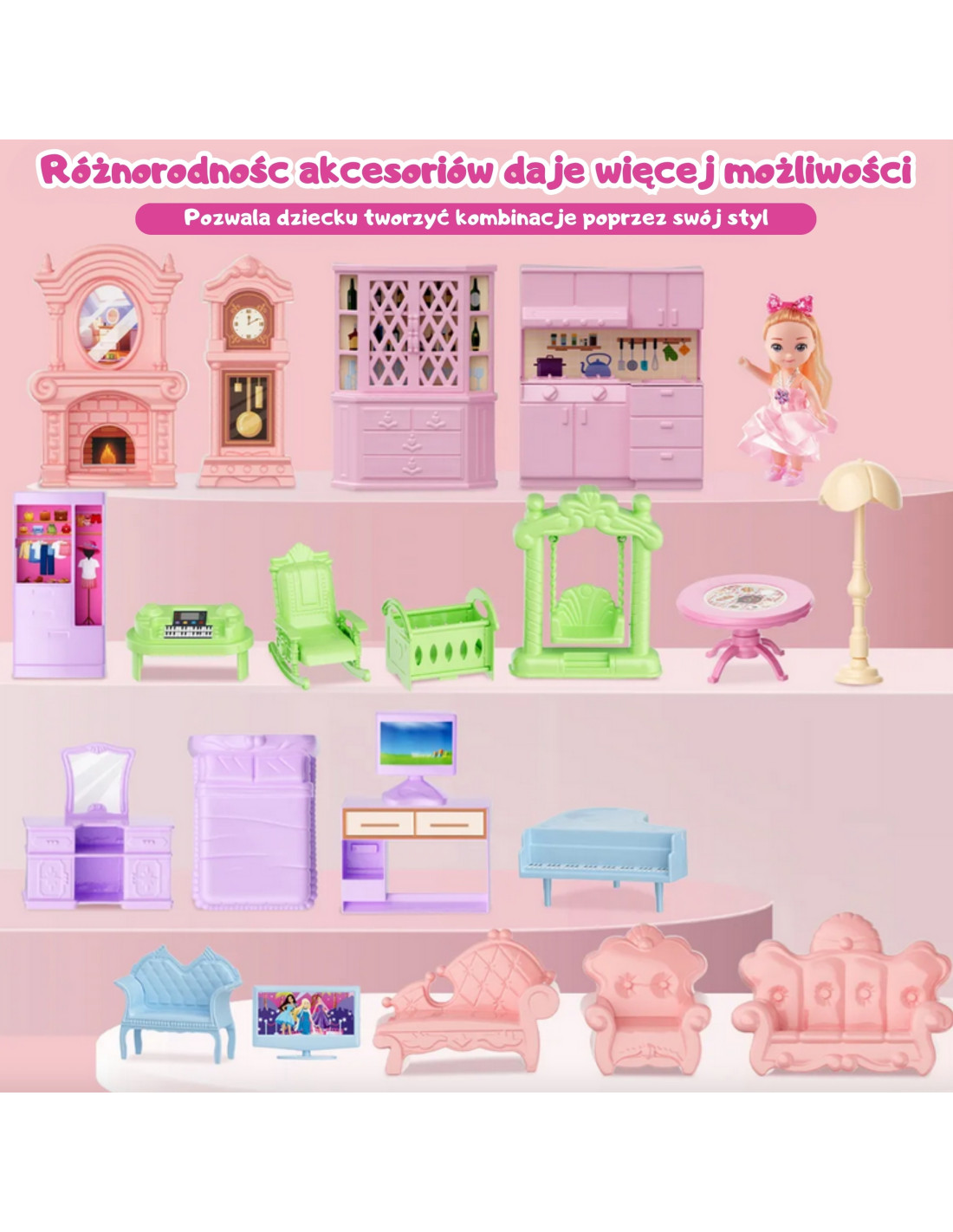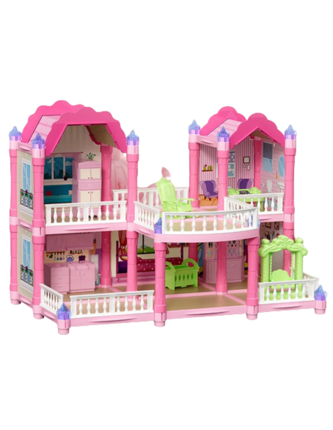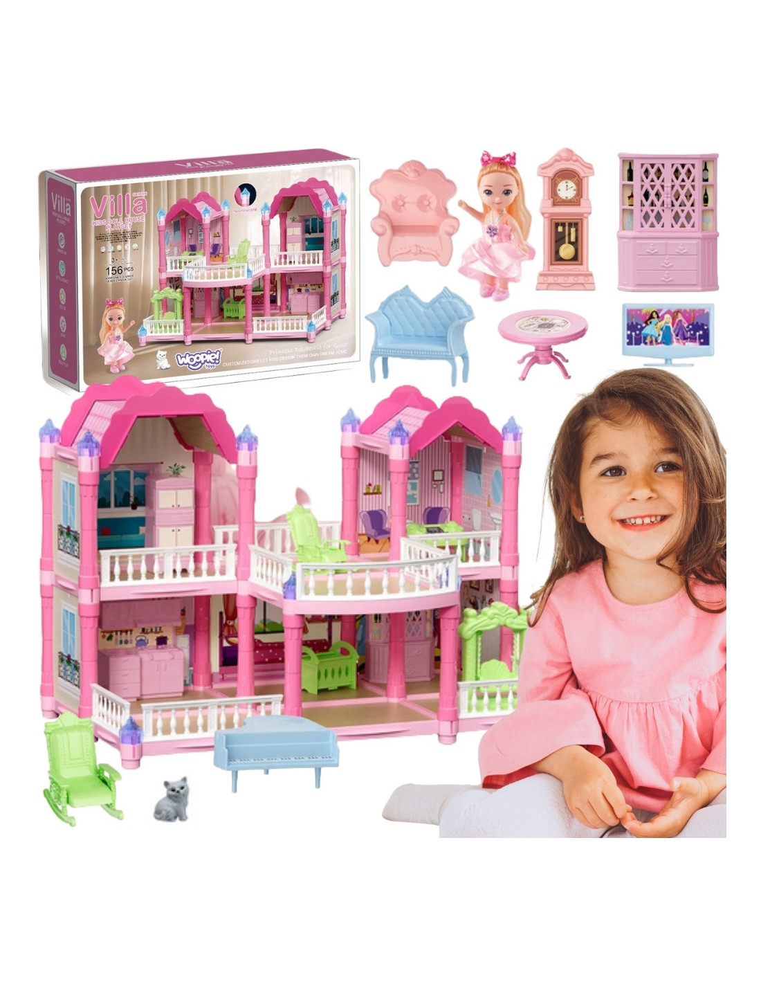 The Garden Villa from Woopie is a unique dollhouse that will provide children with hours of magical play and creative design! This toy transports little ones to a fairytale world where they can create their own stories, arrange the interior, and role-play as their favorite characters. It's more than just a toy—it's a whole world that children can create on their own! The unique two-story structure, with beautiful details, multiple rooms, a terrace, realistic furnishings, and glowing turrets , makes the house look like a real princess palace! The color scheme is delicate pastels—pink, purple, and mint—create a welcoming atmosphere that encourages creative play. It's perfect for playing with friends or siblings.