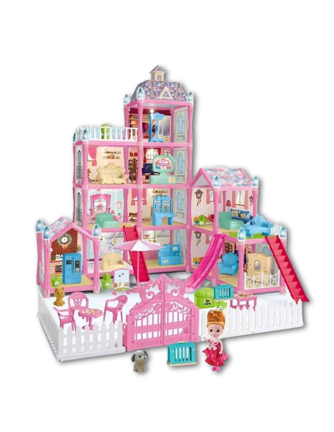 - - Numerous pieces of furniture and accessories, including a table with chairs, a sofa, a bed, a wardrobe, a refrigerator, a slide and stairs.